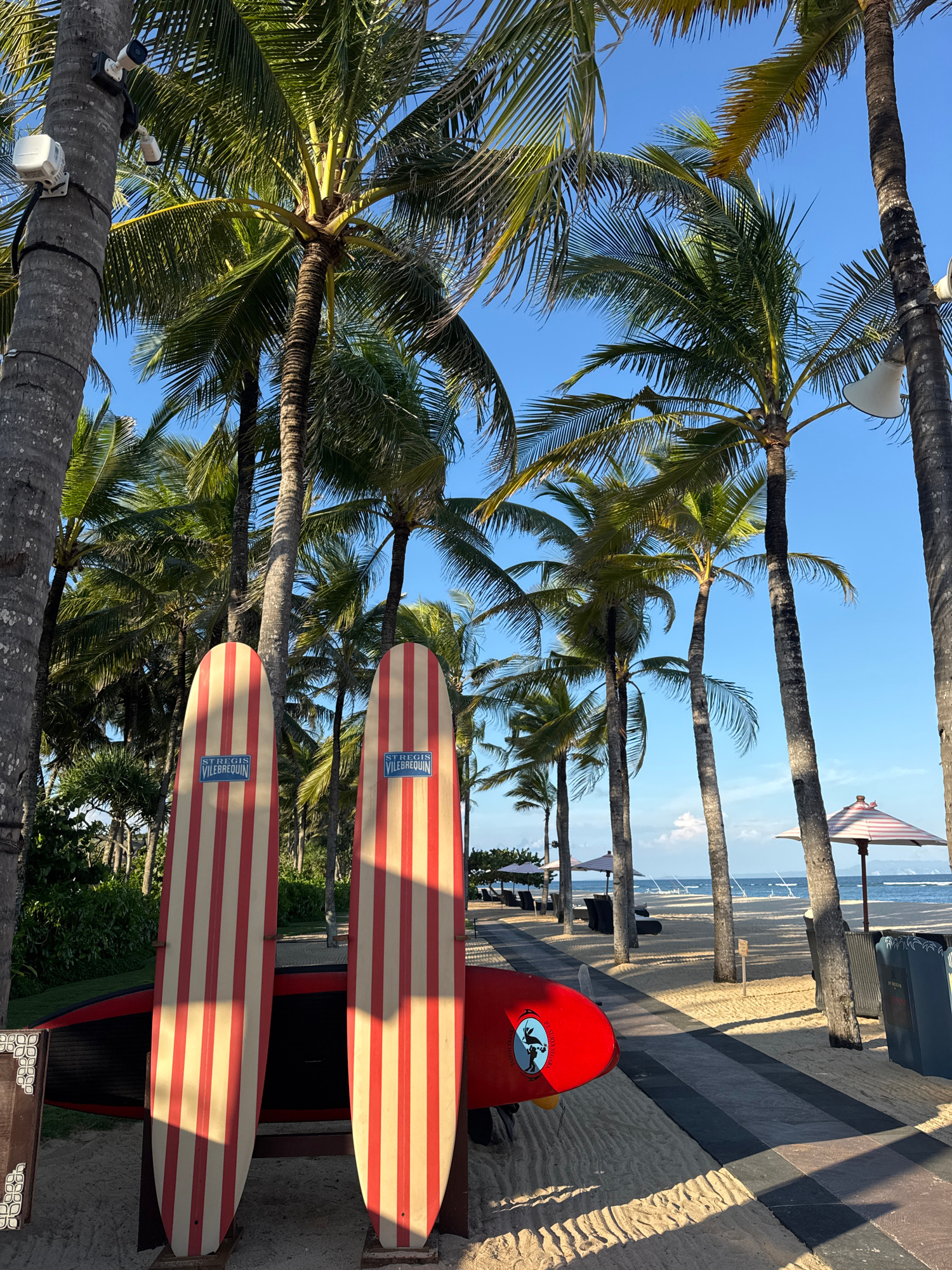 The image depicts a tropical scene, possibly a beach resort, in an undetermined location in Indonesia. The foreground features two surfboards with red and white stripes, leaning against a dark wooden…read more