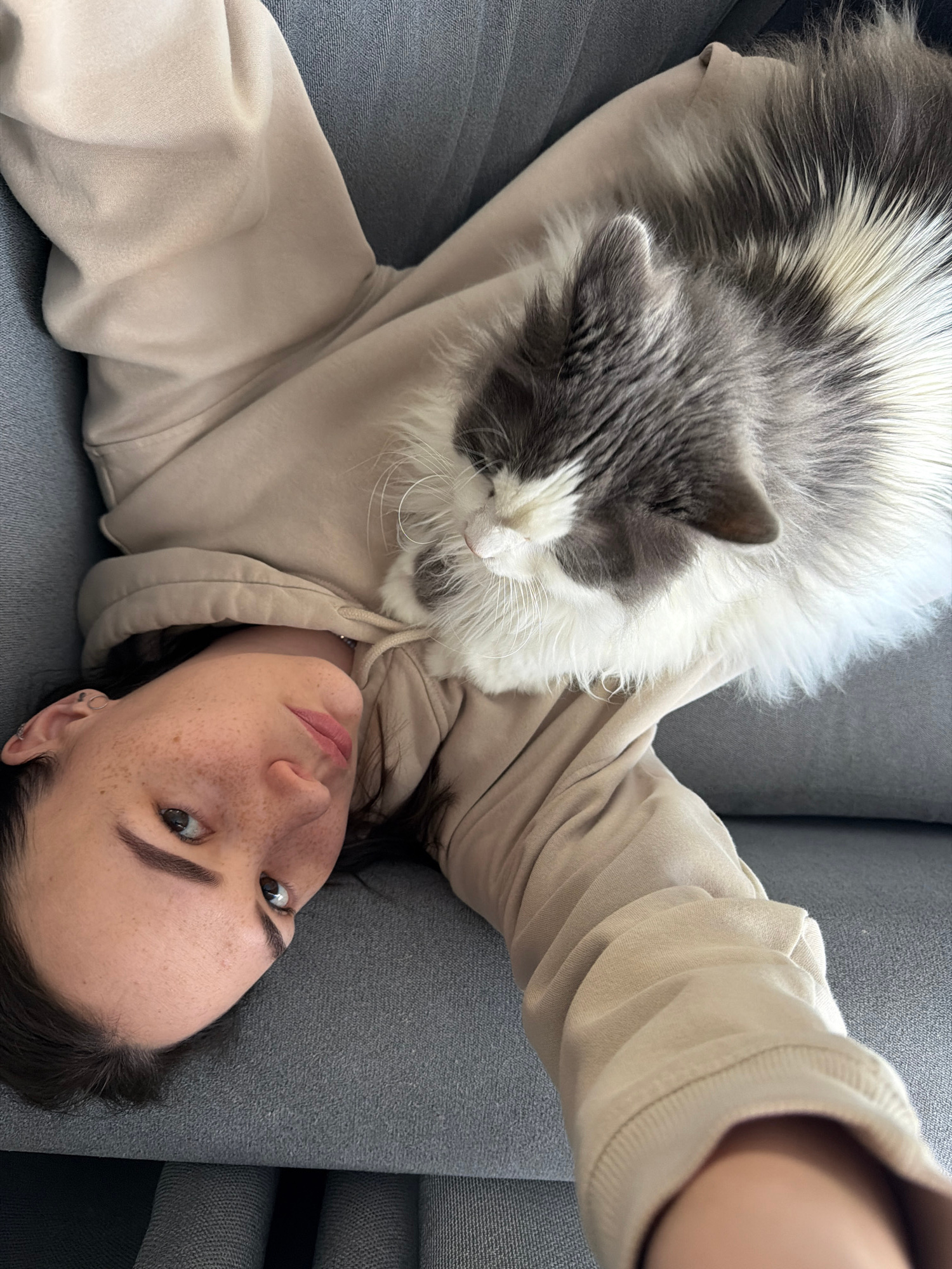 An overhead shot captures a young adult woman lying on her back on a grey fabric sofa, with a fluffy cat resting on her chest, in what appears to be a home in Chaikovsky, Russia. The woman wears a ligβ¦read more