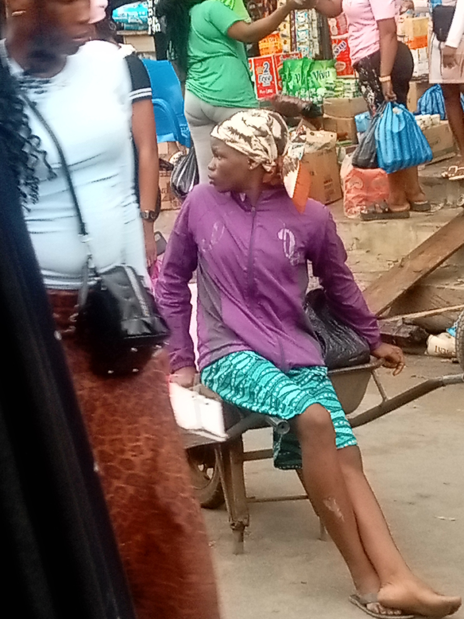 The image shows a woman sitting on a wheelbarrow in what appears to be a market or street scene. She is wearing a purple jacket, a green and blue patterned skirt, a headscarf, and sandals. The wheelba…read more