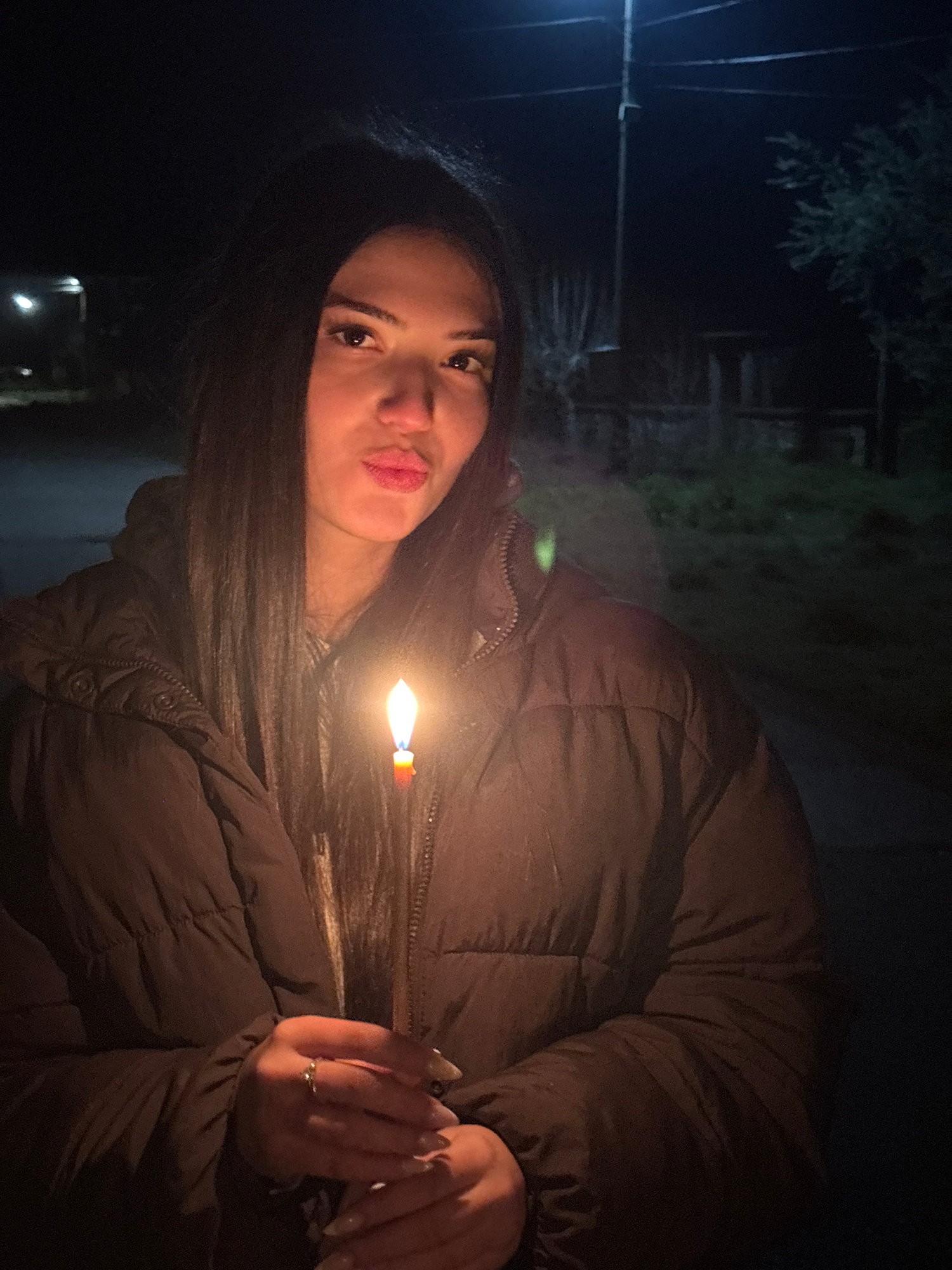 A woman is outdoors in Lehchevo, Bulgaria, at night. She is holding a lit match. She is wearing a dark-colored, puffy jacket and a ring is visible on her right hand. Street lighting is faintly visible…read more