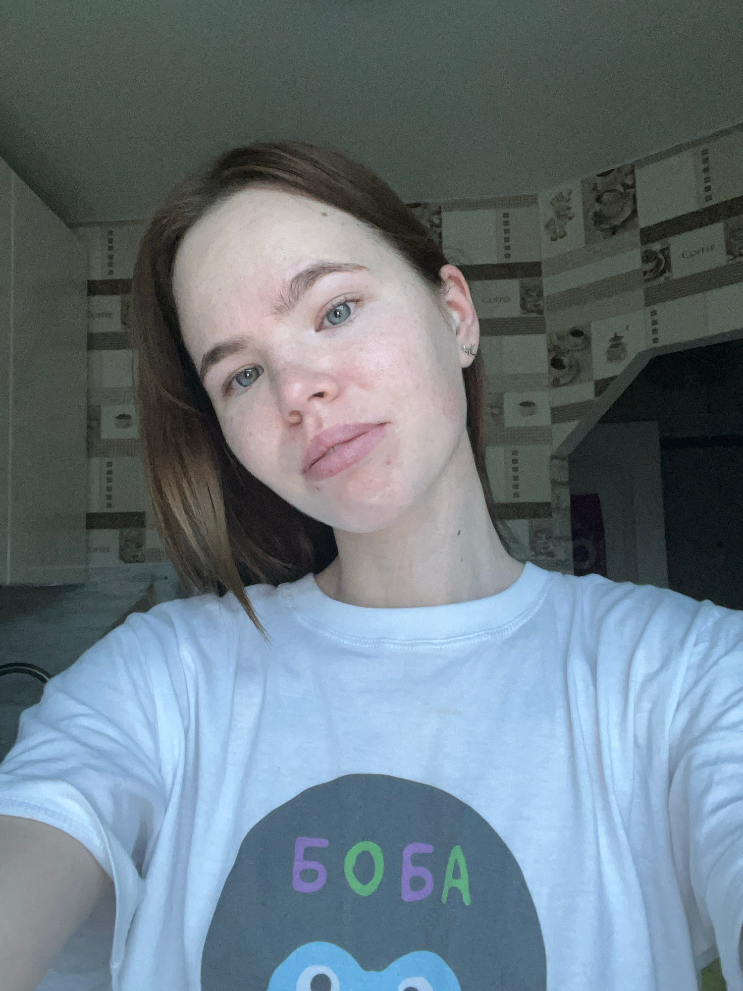 A selfie portrait of a person with light skin, blue eyes, and brown hair wearing a white t-shirt with a graphic design featuring the word "BOBA" in vertical text with differently colored letters. The…read more