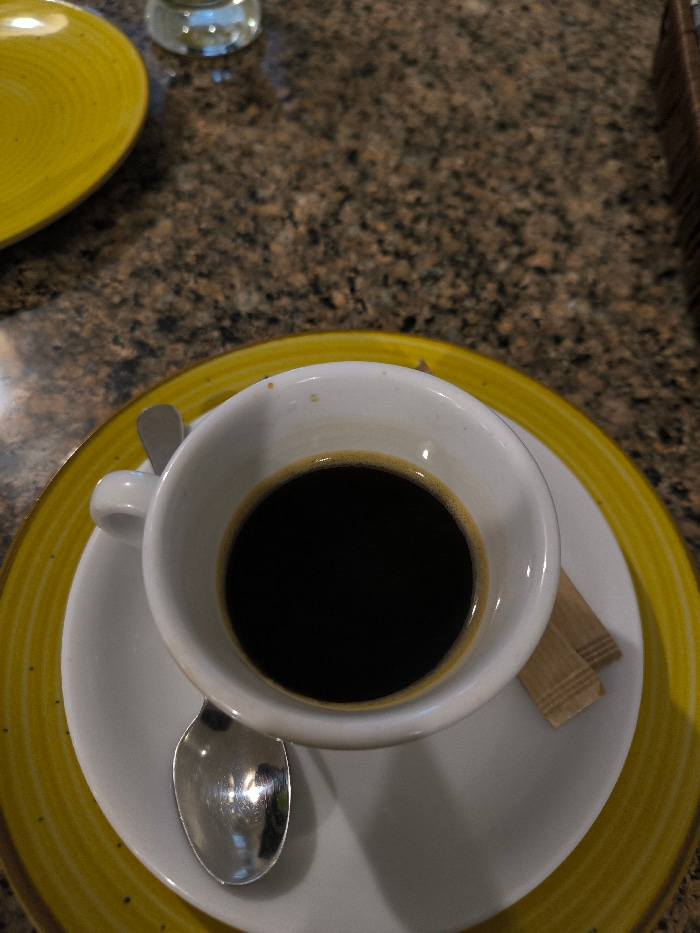 The image displays a high-angle view of a single serving of black coffee on a table. The central subject is a white ceramic cup, approximately three-quarters full of a dark brown liquid, consistent wi…read more