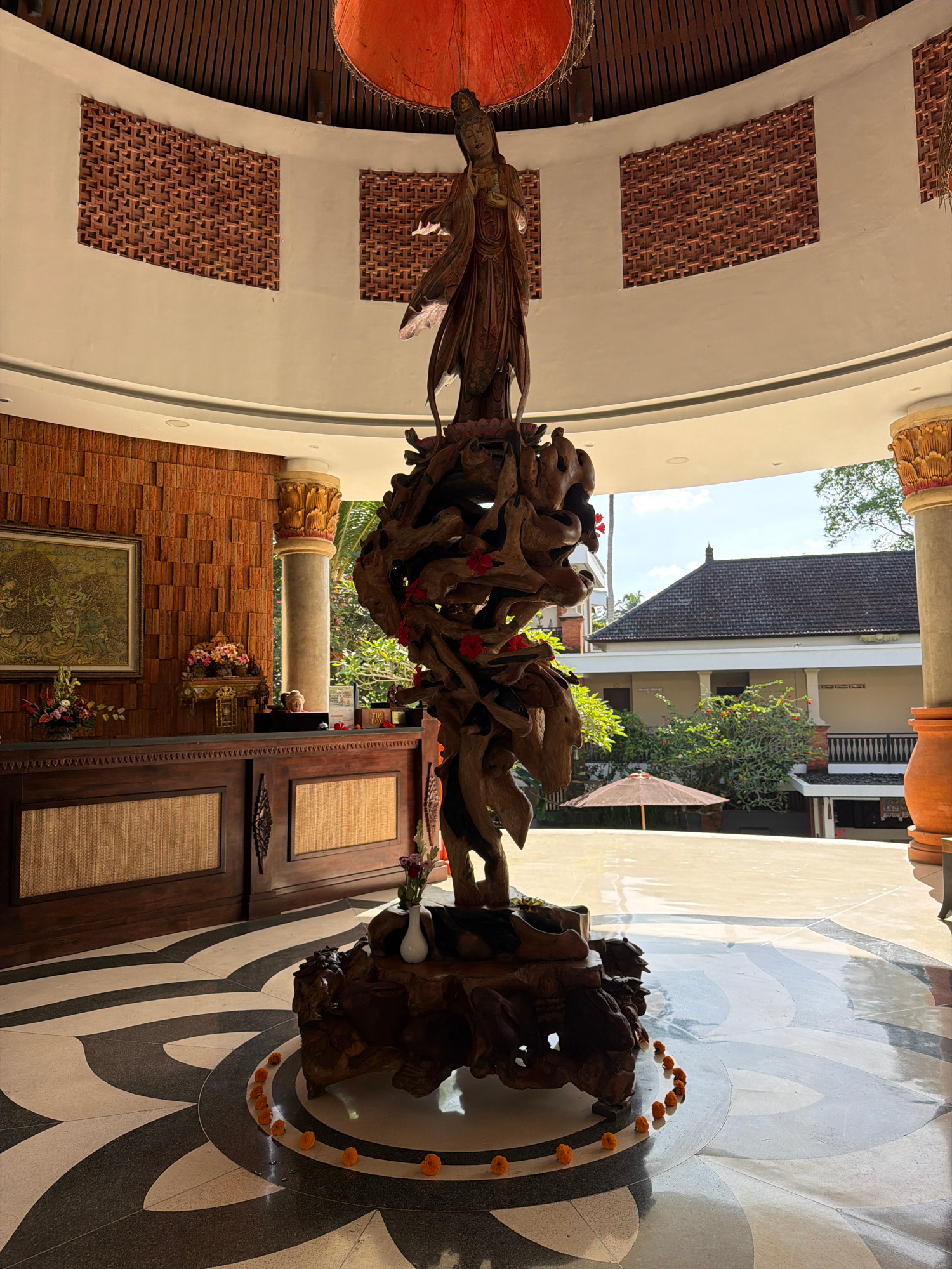 The image captures an interior space in Peliatan, Indonesia, showcasing a wooden sculpture as the focal point. The sculpture is a complex arrangement of carved wood pieces, interspersed with small redโฆread more