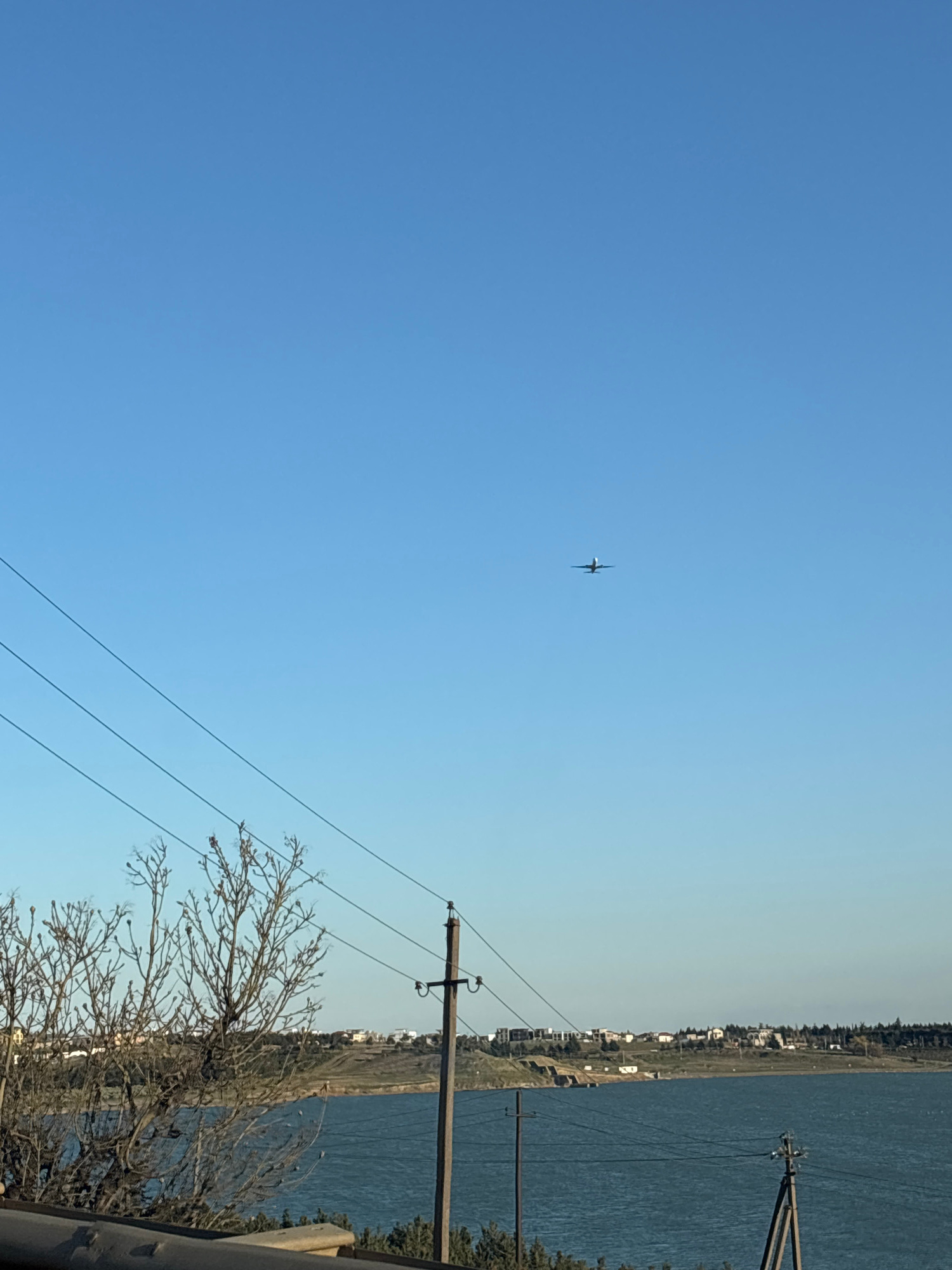 An airplane is in the sky near a river and the edge of the city. There are power poles visible with bare trees. It is daytime. The location is Tbilisi, Georgia.