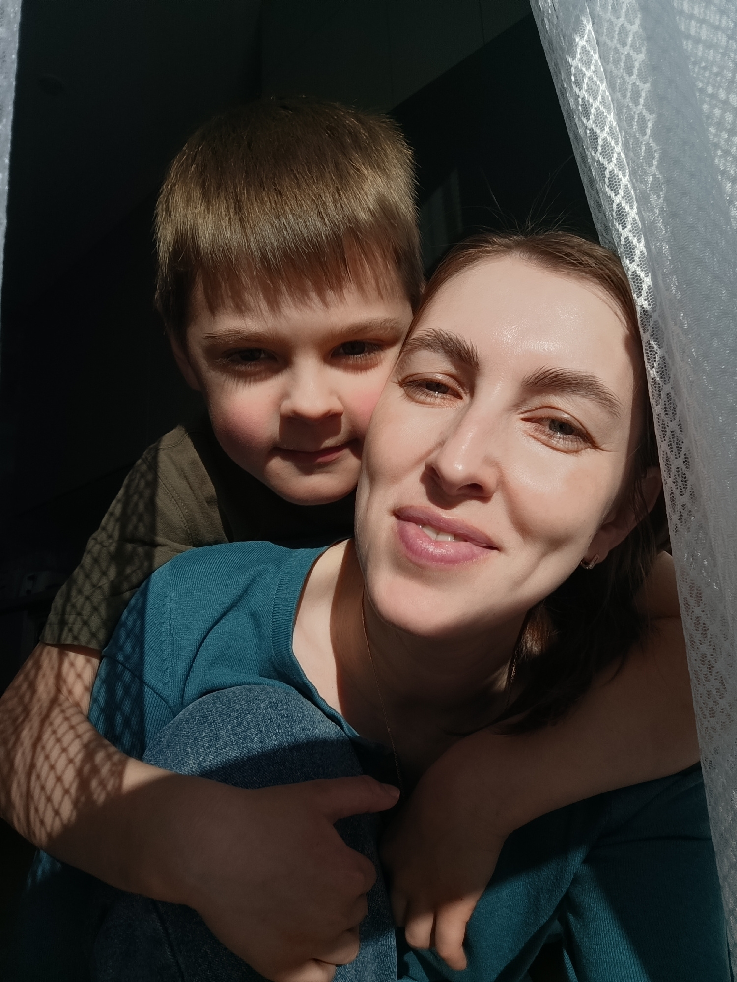 The image shows a woman and a young boy posing indoors. The boy is behind the woman, with his arms around her neck and shoulders. The woman is smiling and looking at the camera. They are close togethe…read more