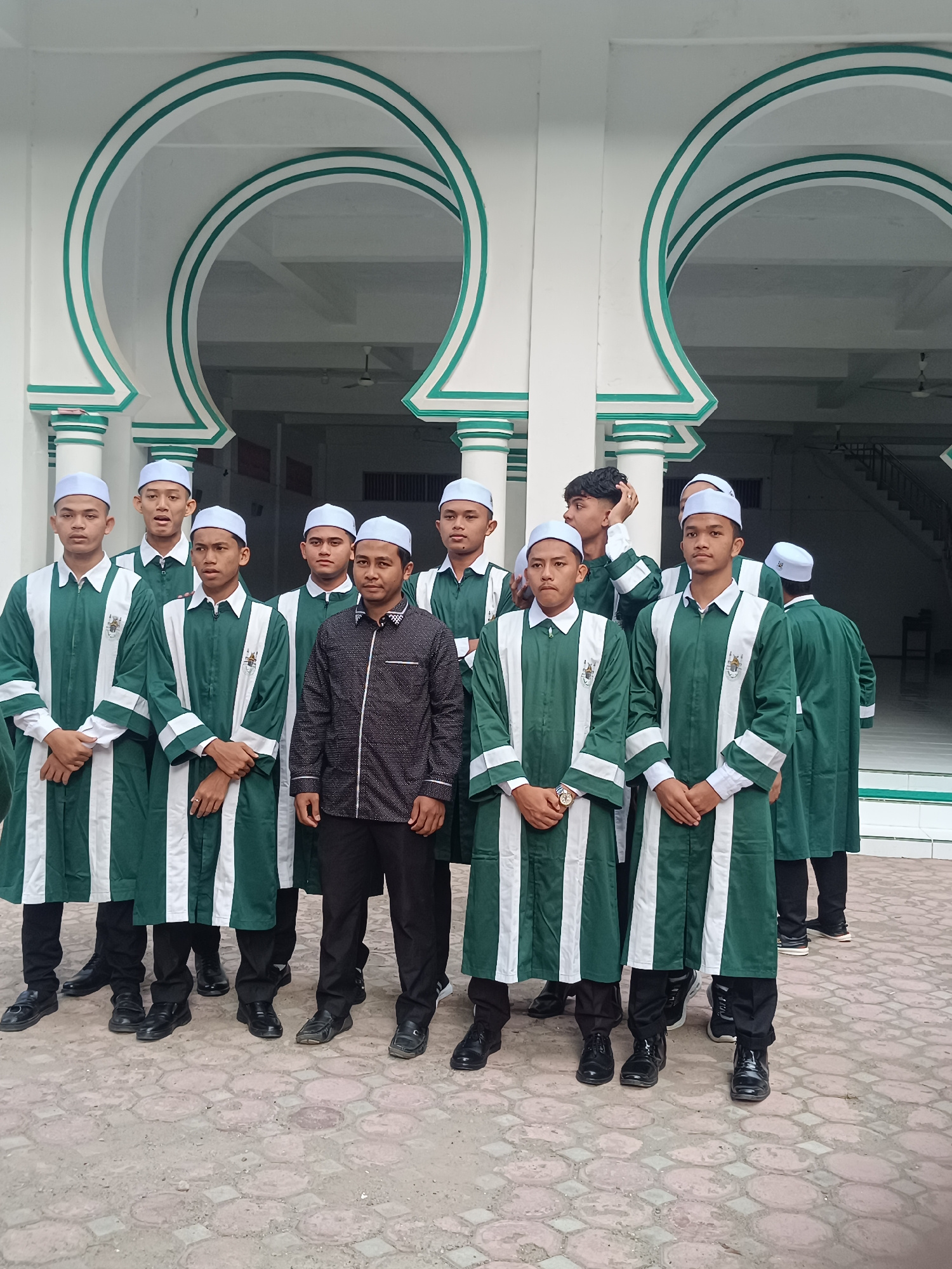 A group of 11 young men are standing in front of a white building with green trim and arched entrances. The men are wearing matching green and white robes and white skullcaps, except for one man in th…read more
