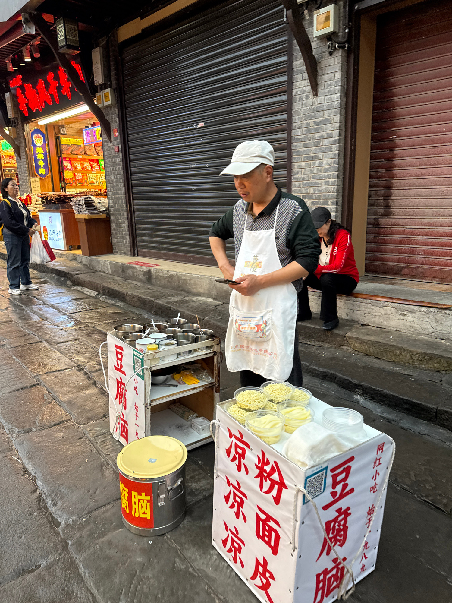 A street vendor in Shapingba District, China, wearing a white apron and a white baseball cap, stands behind a food cart on a paved street. The cart displays containers of noodles and a container label…read more