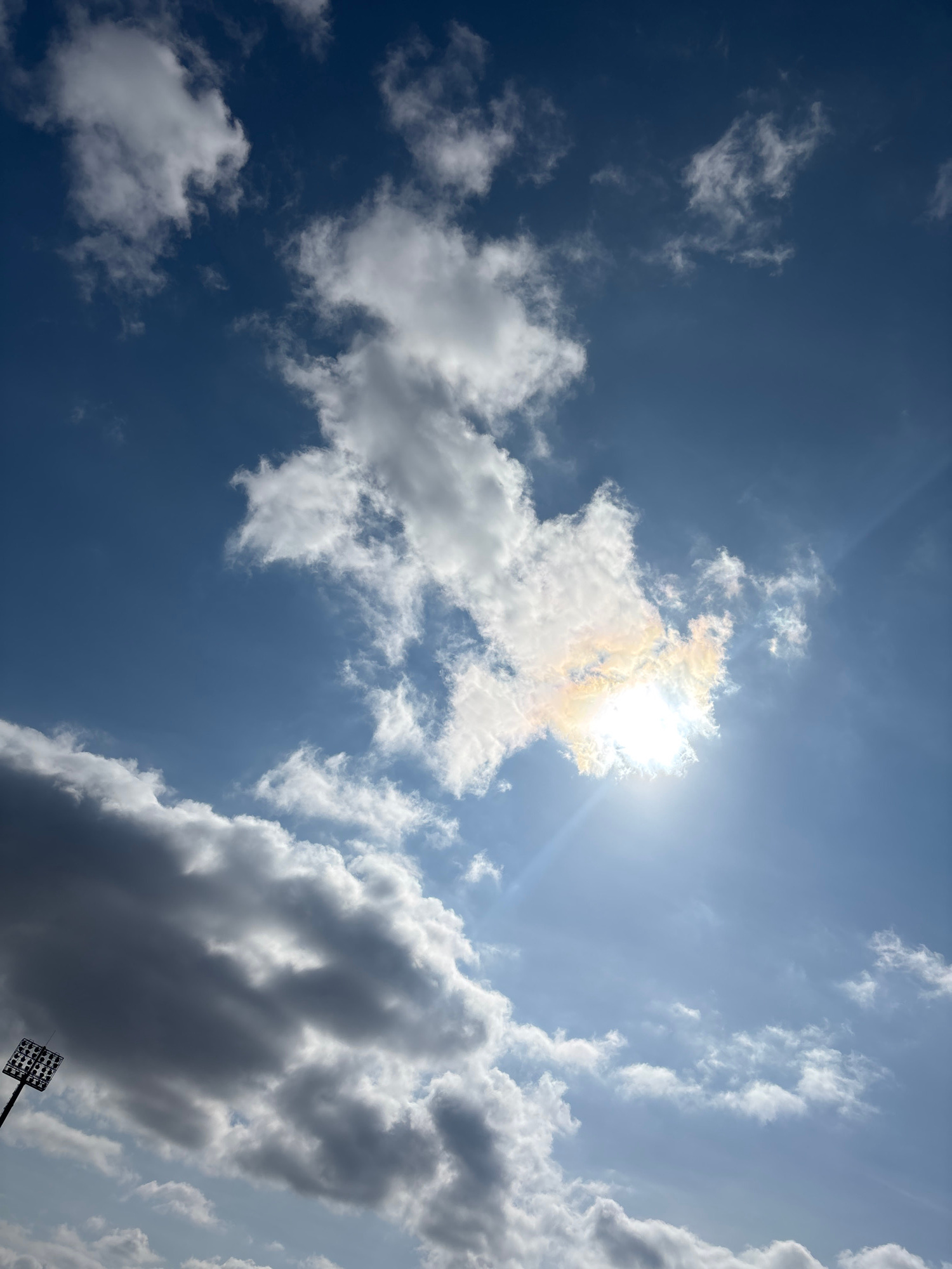 The image presents a daytime sky in Izhevsk, Russia, characterized by a deep blue color interspersed with scattered clouds. The sun is partially obscured by a bright white cloud, casting a halo effect…read more