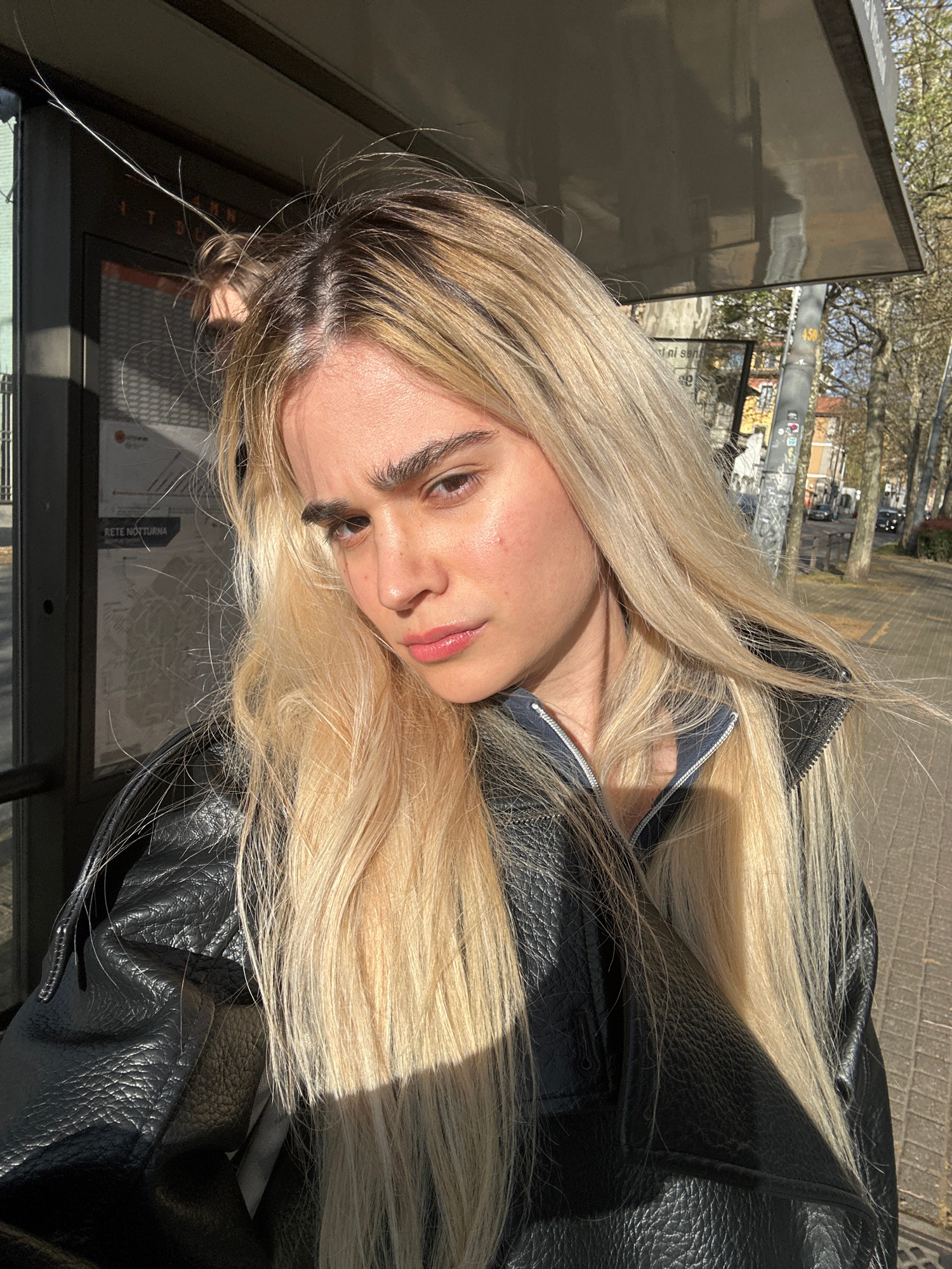 An outdoor, sunlit close-up portrait depicts a young adult female with long blonde hair and visible dark roots, dark eyebrows, and brown eyes. She is looking directly at the camera with a neutral expr…read more