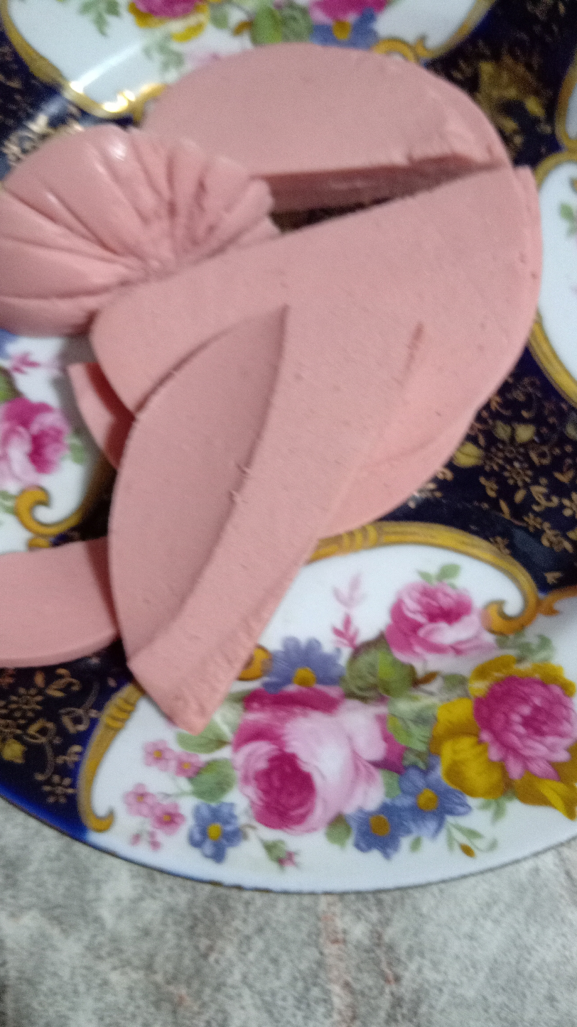 A sliced sausage arrangement rests on a floral-patterned plate. The plate features pink roses, blue flowers, and yellow accents against a white background. The plate also has a navy-blue border and go…read more