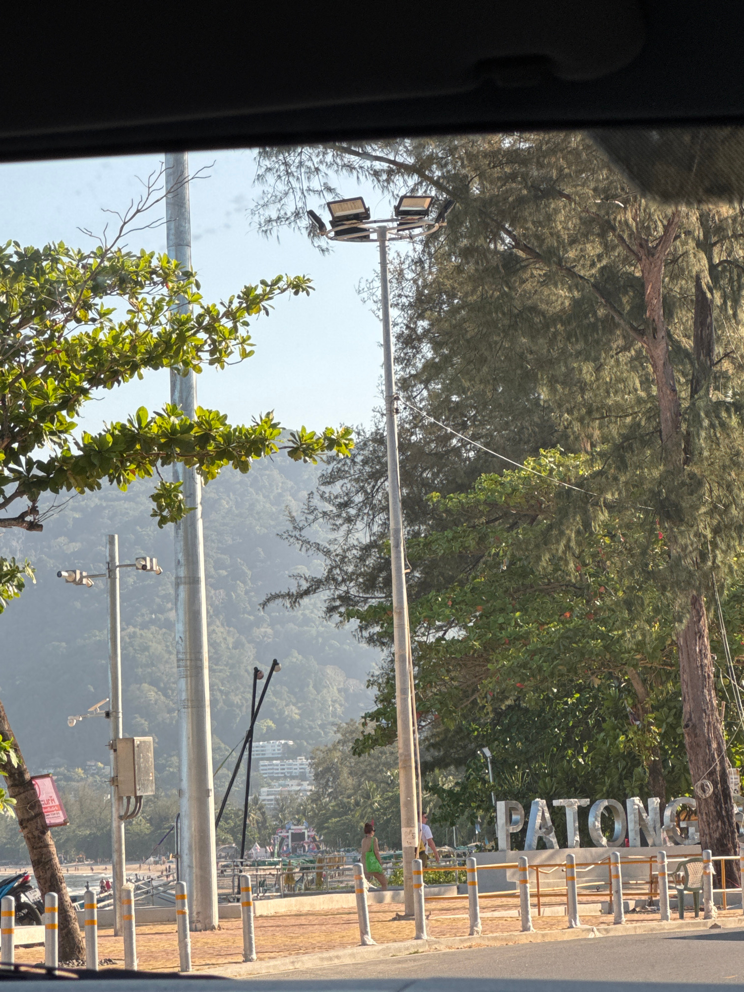The image shows a view from inside a vehicle, looking out at a scene in Patong, Thailand. The "PATONG" sign is prominently displayed along the road. Numerous utility poles with street lights and surve…read more