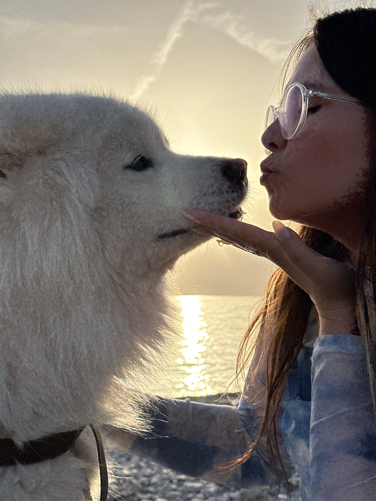 The image shows a woman and a large, white dog in close proximity. The woman is wearing glasses and a dark head covering, and she is touching the dog's face with her hand. The dog is looking up at the…read more