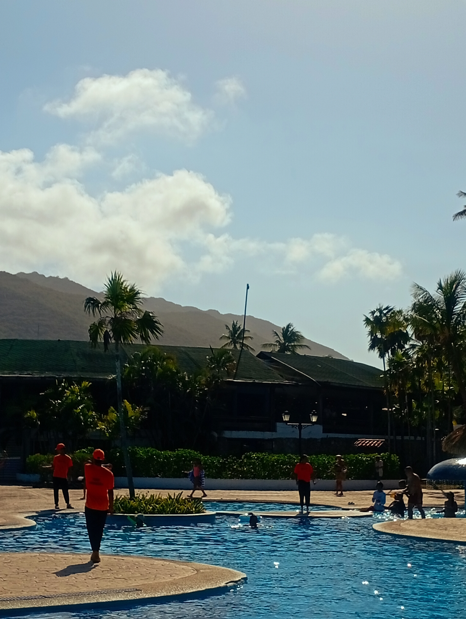 Playa El Agua, Venezuela. An outdoor swimming pool area is populated with several individuals engaged in various activities. Two people wearing orange shirts and dark pants stand on the pool deck, one…read more