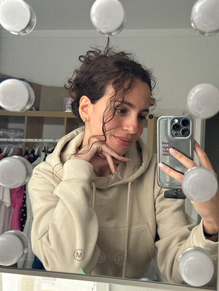 A female subject is depicted in a mirror selfie taken within what appears to be a dressing room or retail backroom. The subject has dark, curly hair pulled back, with strands framing her face, and is…read more