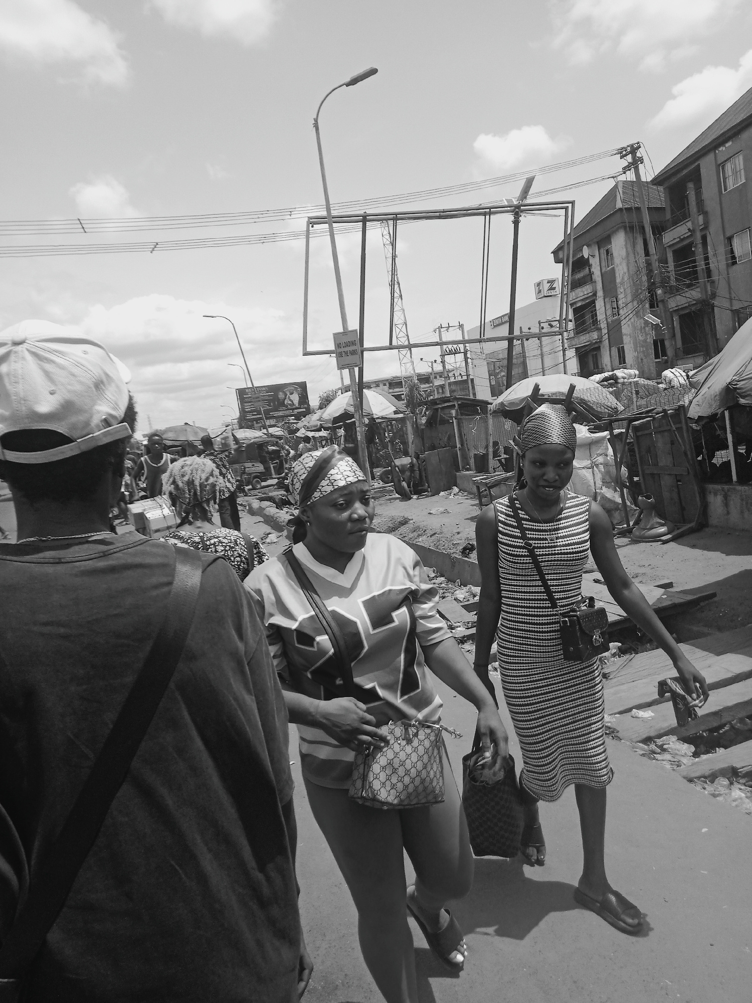 The black and white photograph depicts a bustling street scene, likely a market or commercial area in an urban environment. The image is captured from a pedestrian's perspective, with several individu…read more