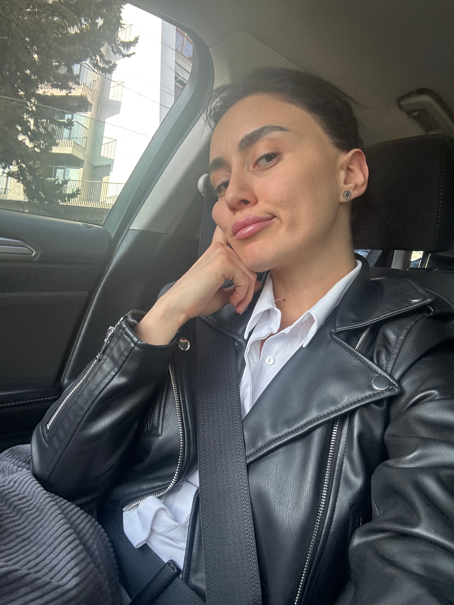 A person with dark hair is seated in a car, wearing a black leather jacket over a white collared shirt and a seatbelt. The individual's head is resting on a hand. Outside the car window, a building ca…read more