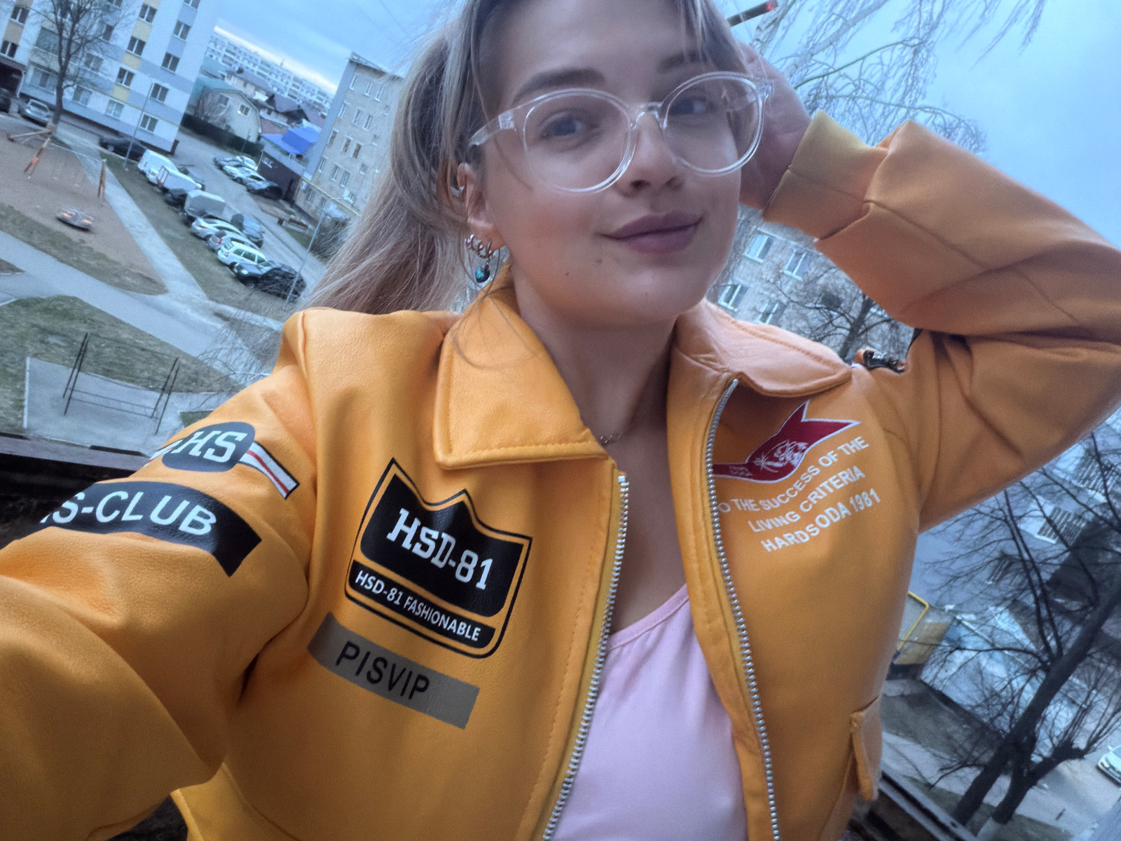 The image shows a person wearing glasses and a yellow jacket with patches and lettering, including "HS", "S-CLUB", "HSD-81", "HSD-81 FASHIONABLE", "PISVIP", and "THE SUCCESS OF THE LIVING CRITERIA HAR…read more
