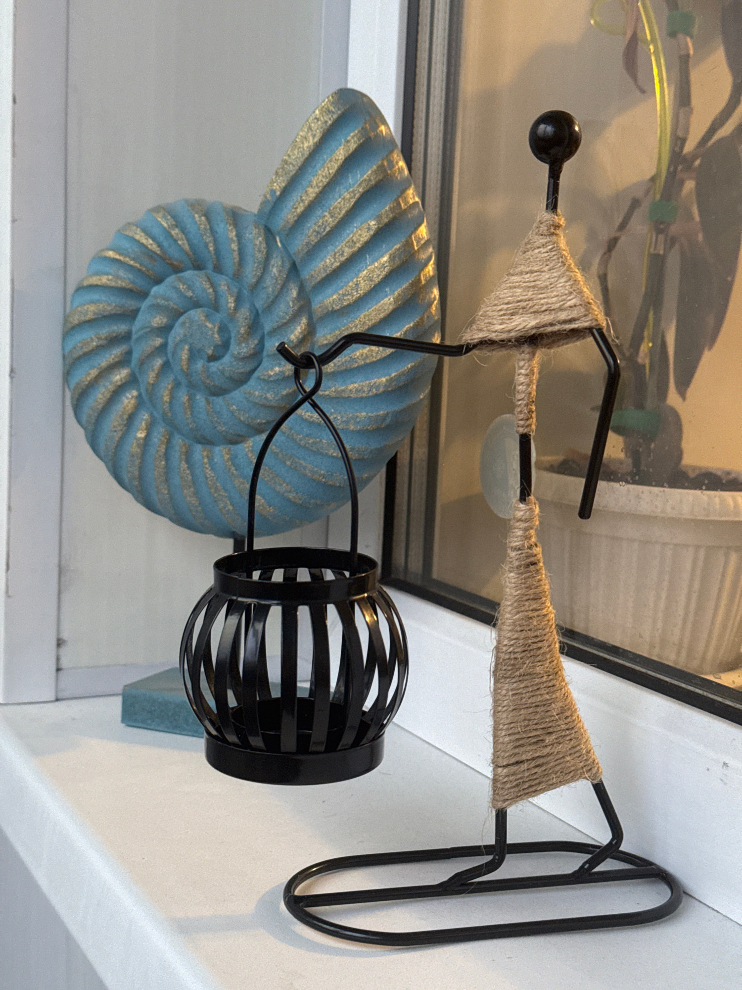 A black metal lantern hangs on a white wall next to a blue and gold seashell. The lantern has a bulbous cage design and is attached to a metal frame decorated with twine. The location of the scene can…read more