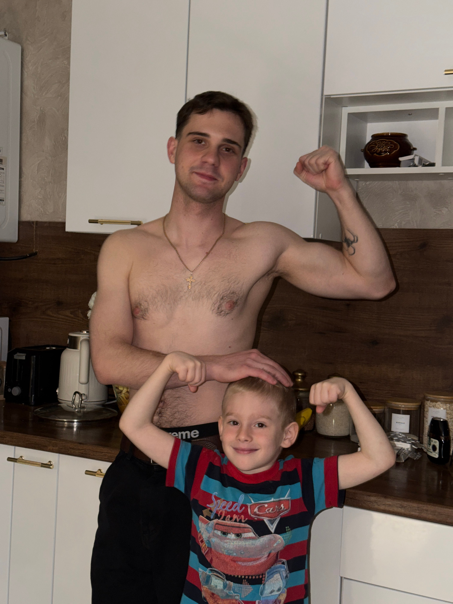 A shirtless man with short brown hair, wearing a gold chain, stands in a kitchen in Rossiyskiy, Russia, flexing his left arm. He has a tattoo on that arm. A young boy in a blue and red striped shirt with a Cars graphic is positioned next to him, also flexing his arm. The man's left hand rests on the boy's head. They are positioned on a dark wooden surface, likely a countertop, surrounded by kitchen appliances and storage. White cabinets are visible in the background, along with various containers and a decorative vase. A stainless steel kettle and black electronic device are on the counter. The lighting is bright. | Open Wire