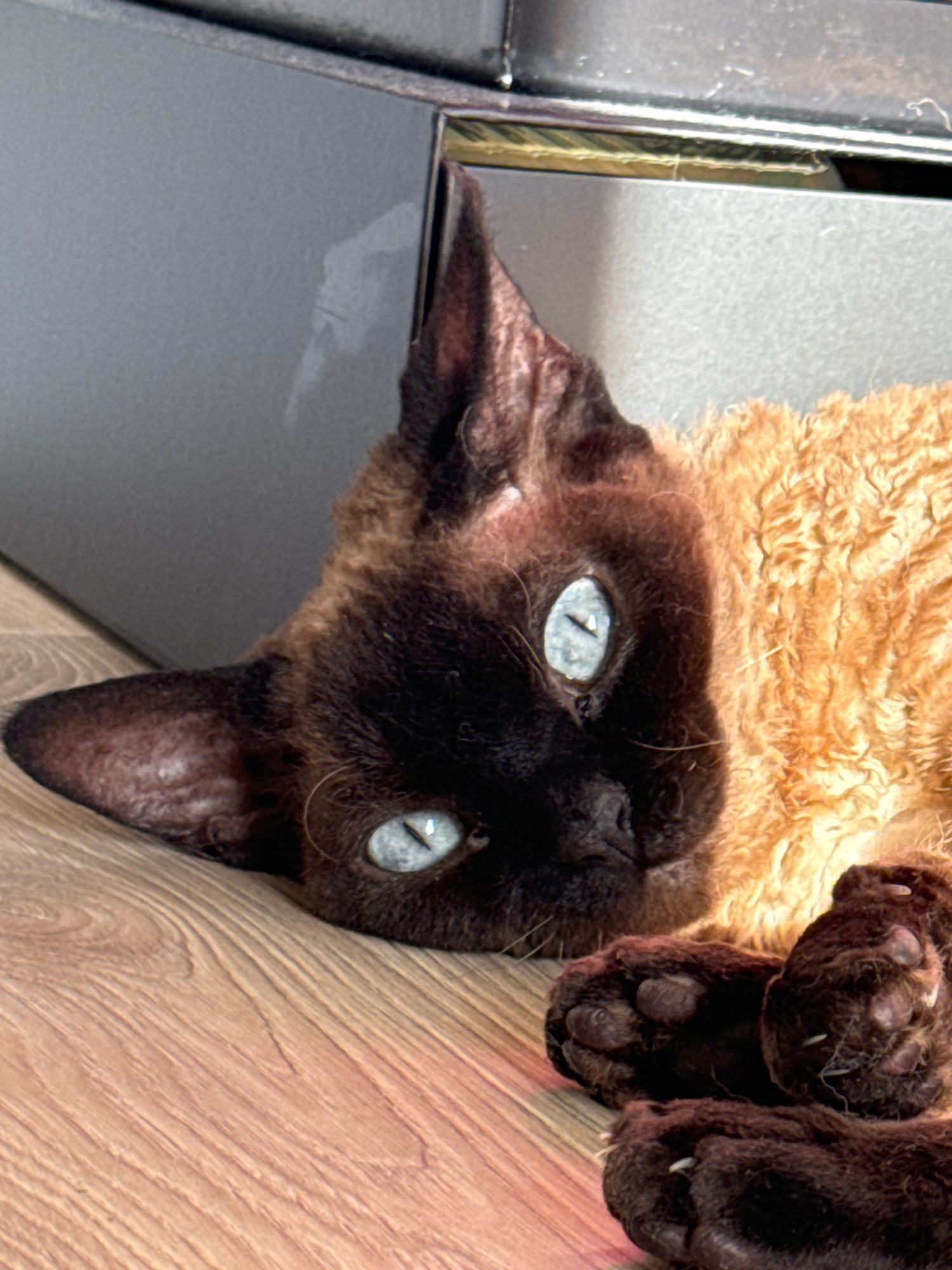 A brown and black Cornish Rex cat with blue eyes is lying on its back with its paws extended upwards. The cat is positioned near a wooden surface and a gray, metallic object, possibly a cabinet or app…read more