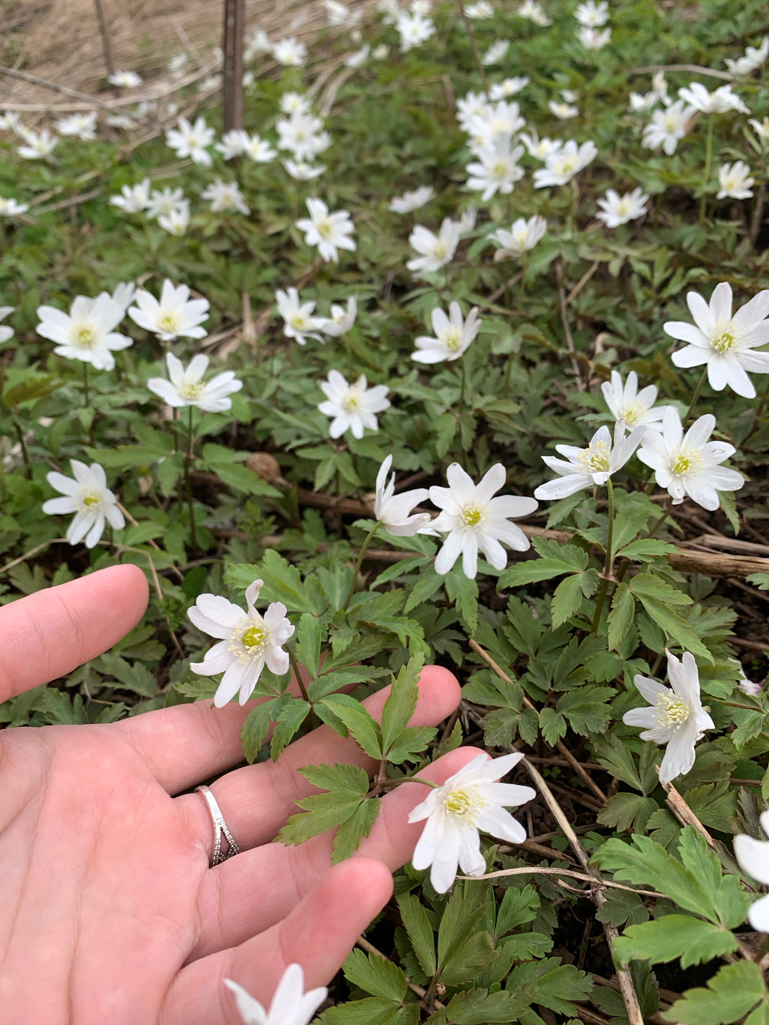An eye-level close-up shot captures a human hand gently placed among a dense patch of white flowers and green foliage. The scene features numerous small, star-shaped white flowers, each characterized…read more