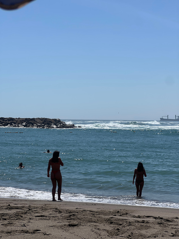 The image captures a sunny beach scene, likely at Playa Chinchorro or Playa La Lisera in Arica, Chile. The foreground features dark-colored sand, leading to the ocean under a clear blue sky. Two adul…read more