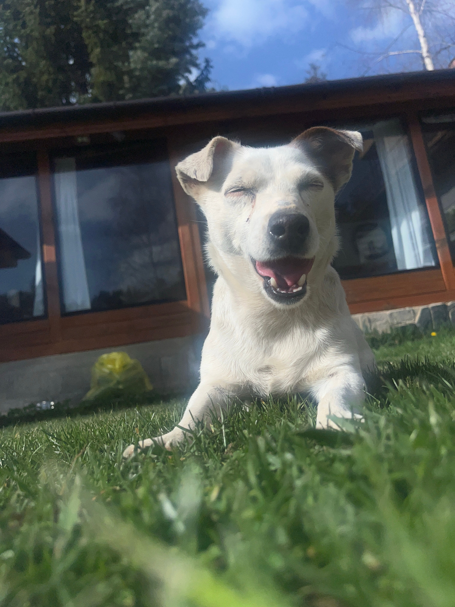 The image shows a white dog lying on a patch of green grass. The dog has brown markings on its ears. Its eyes are closed, and its mouth is open with its tongue visible. Behind the dog is a building wi…read more