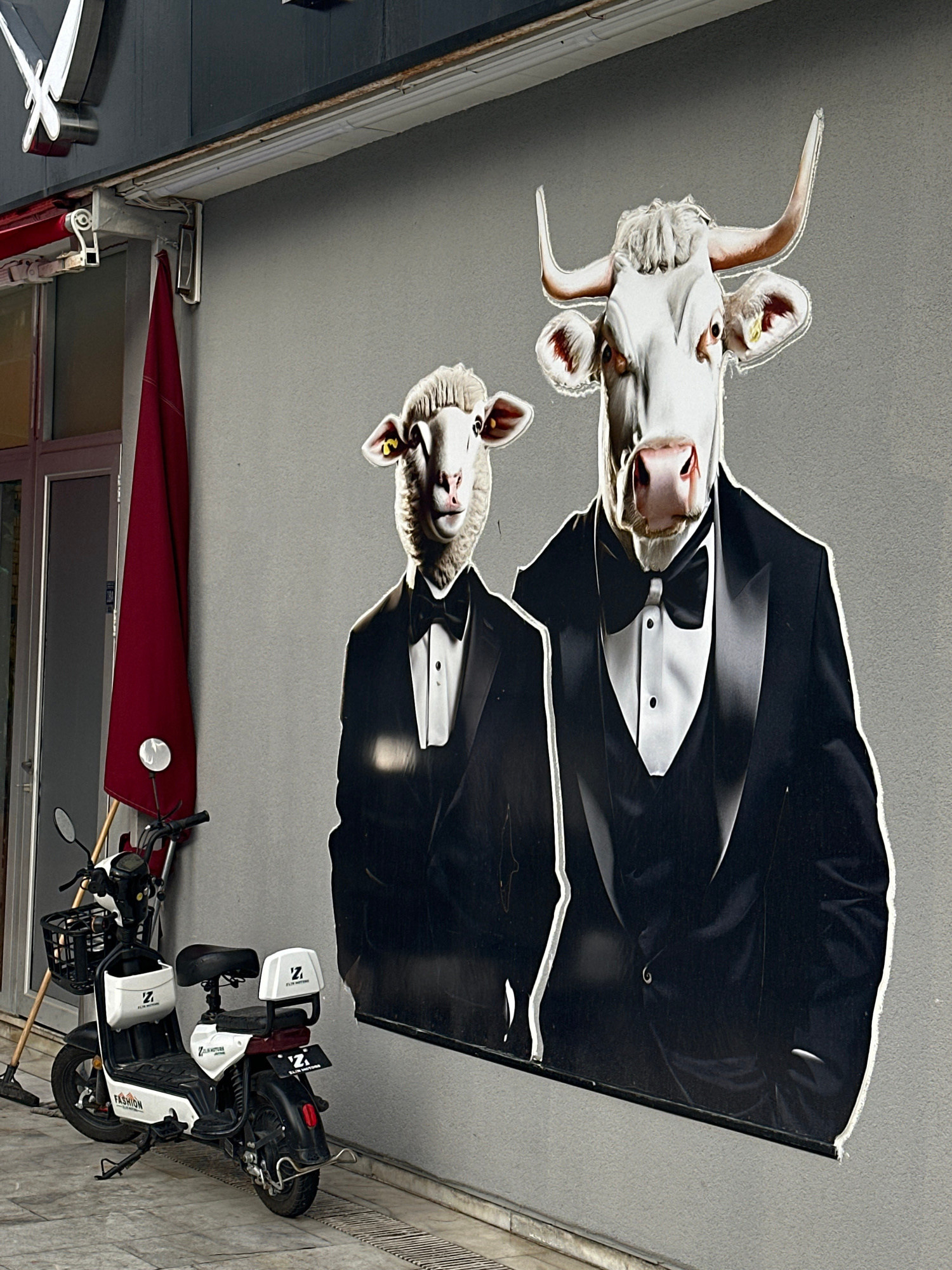 The image shows the exterior of a business in Marmaris, Turkey. Two cut-out images of animals wearing tuxedos hang from the ceiling or awning, one of a long-horned cow and the other of a sheep. Below,…read more