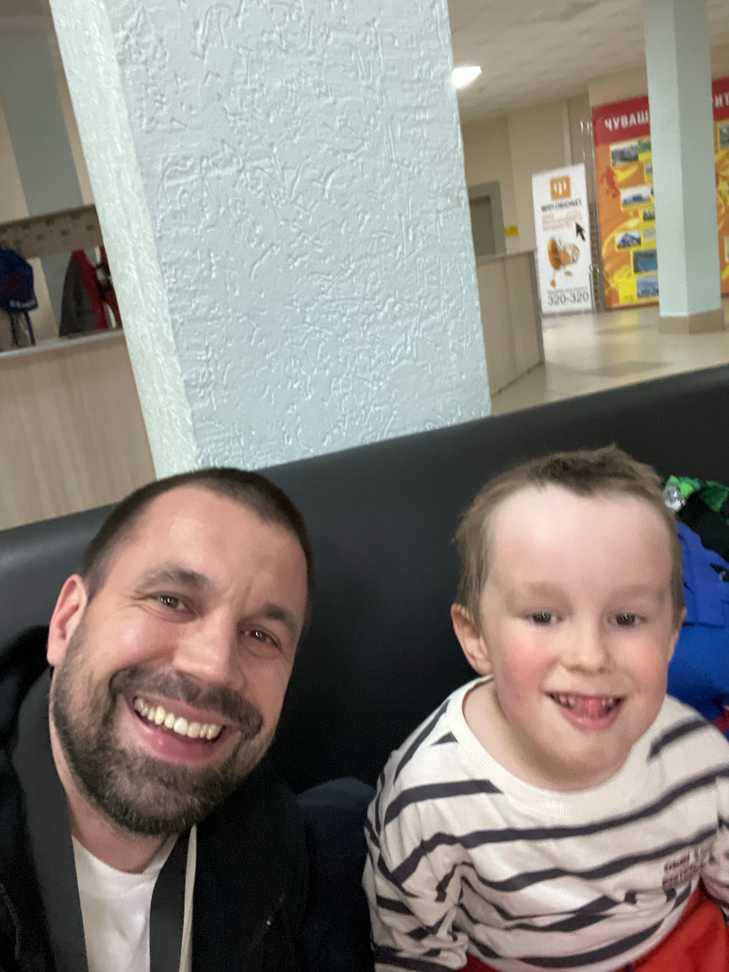A joyful, close-up selfie captures a man and a young child seated indoors. Both subjects are smiling broadly, conveying happiness and warmth. The man, in the foreground, has a dark beard and short dar…read more