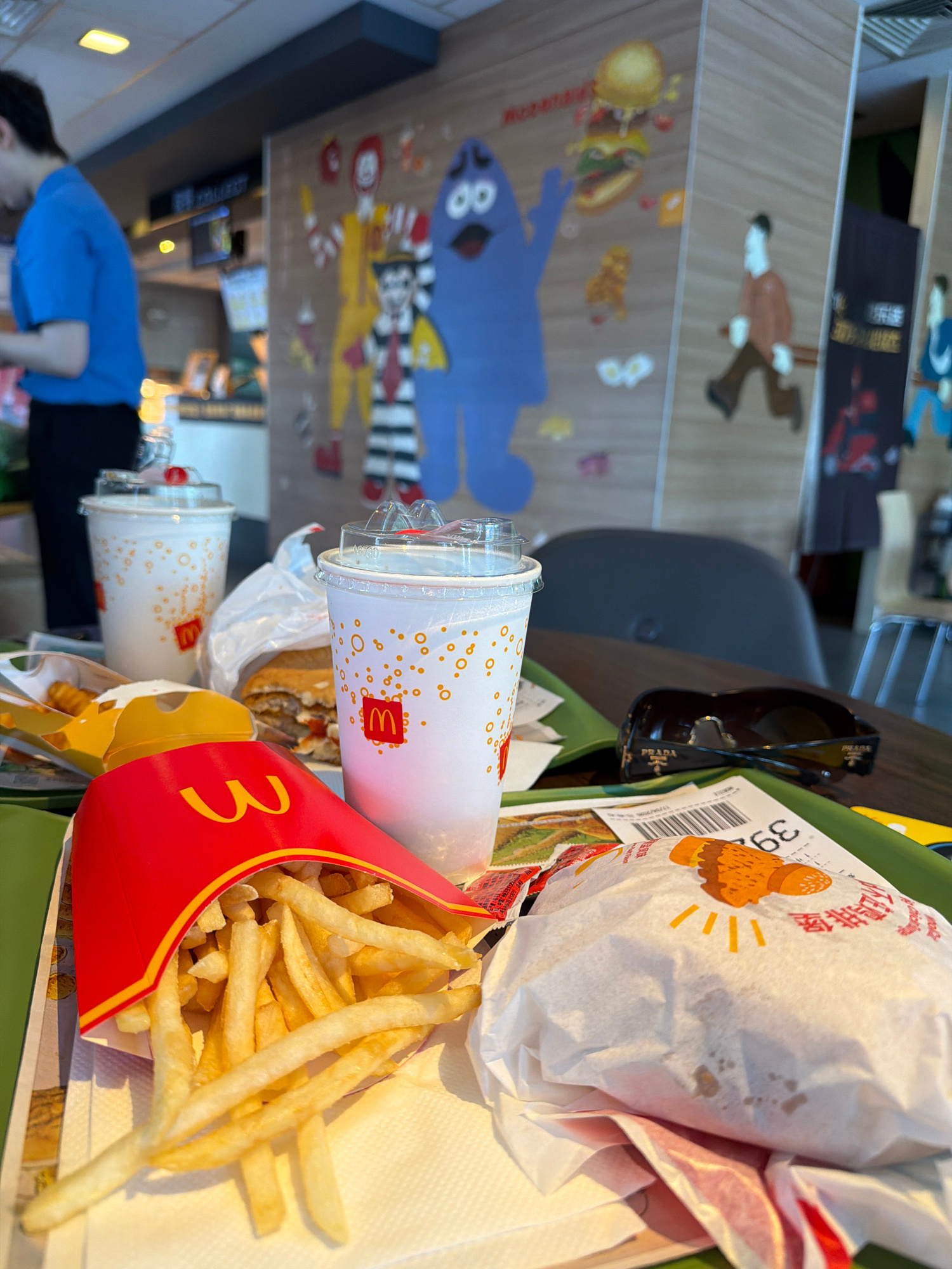This image captures a close-up, tilted view of a McDonald's meal set on a table inside a restaurant. The scene is dominated by fast food items: a red McDonald's fries carton, filled with golden French…read more