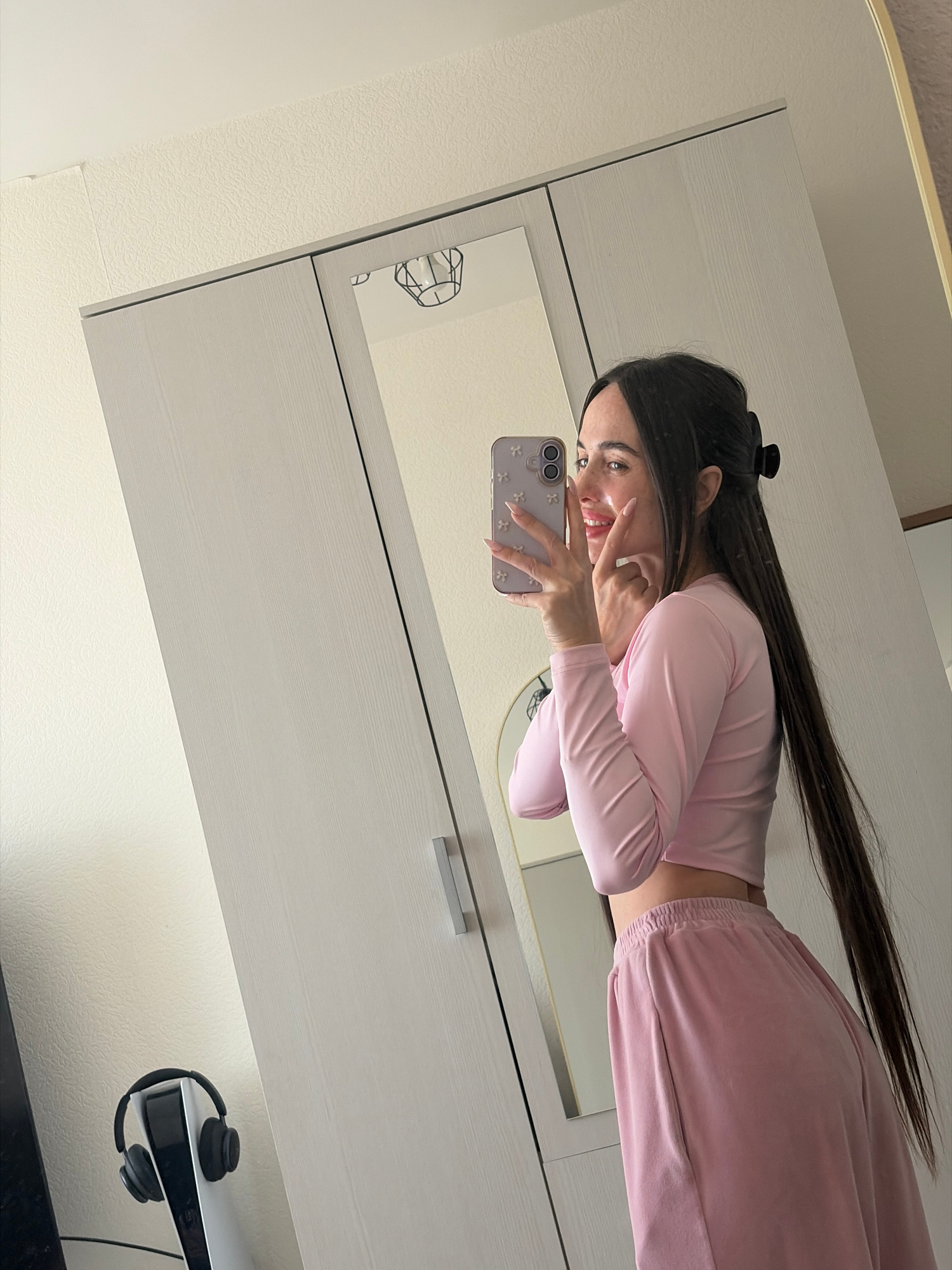 A woman takes a selfie in a mirror inside what appears to be an apartment. She wears a pink top and pants. Her hair is long and dark. In the background is a white cabinet or dresser. There are headpho…read more