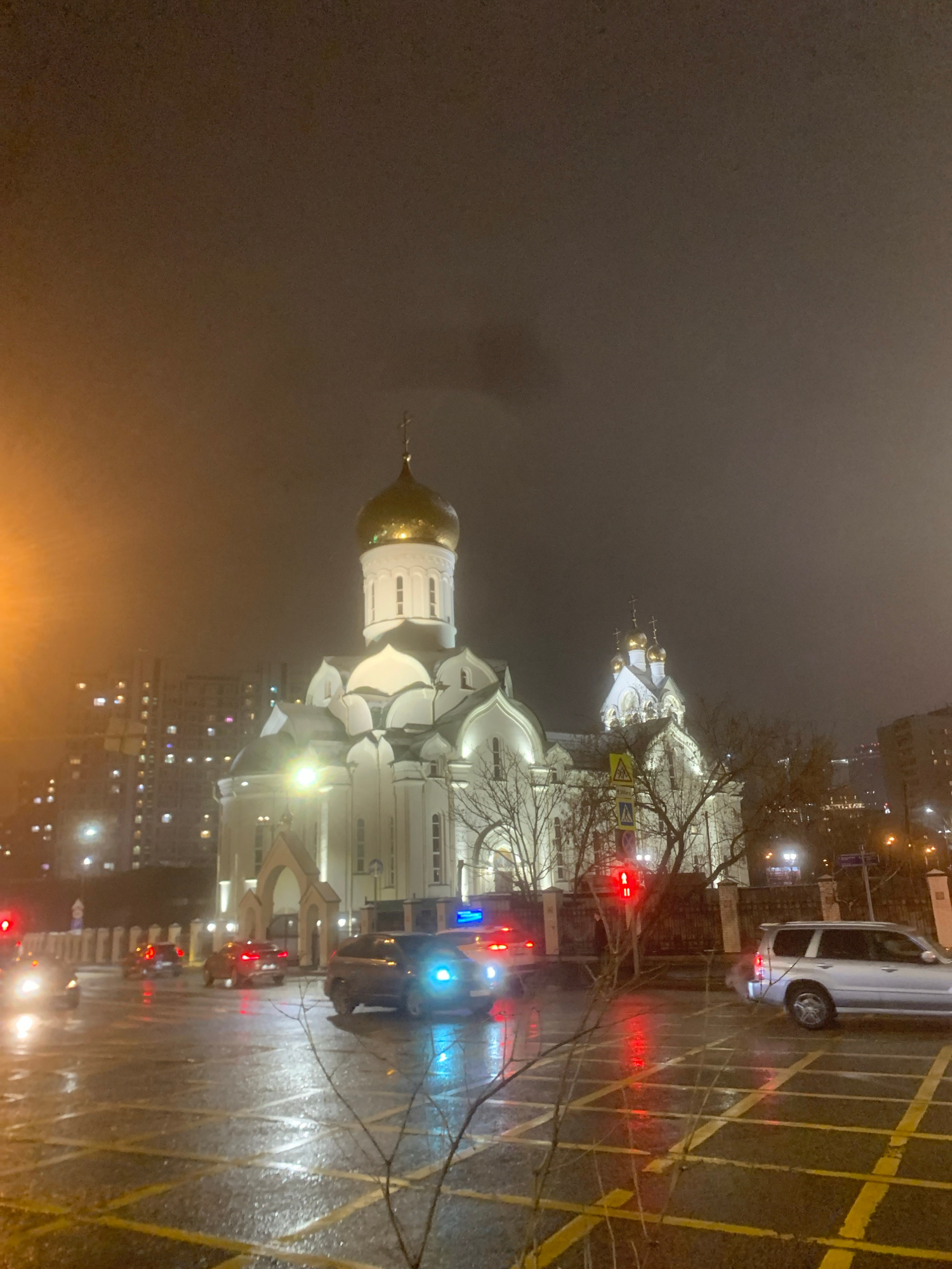 The image depicts a night scene in Moscow, Russia, featuring the Church of the Life-Giving Trinity in Khoroshevo. The church is prominently visible, illuminated by artificial lights, contrasting with…read more