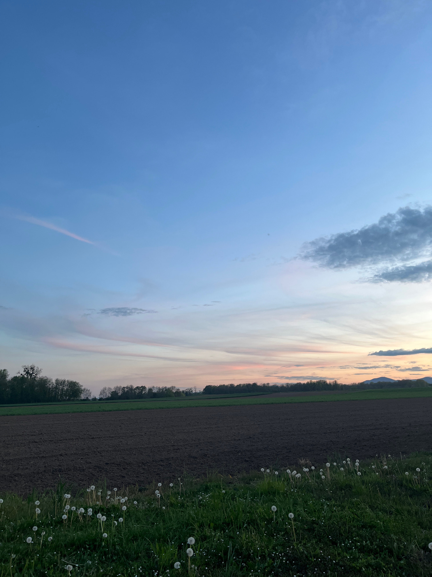The image displays a tranquil rural landscape at sunset, likely in Limersheim, France. The scene is dominated by a vast sky that transitions from a clear, deep blue on the left to softer hues of pale…read more