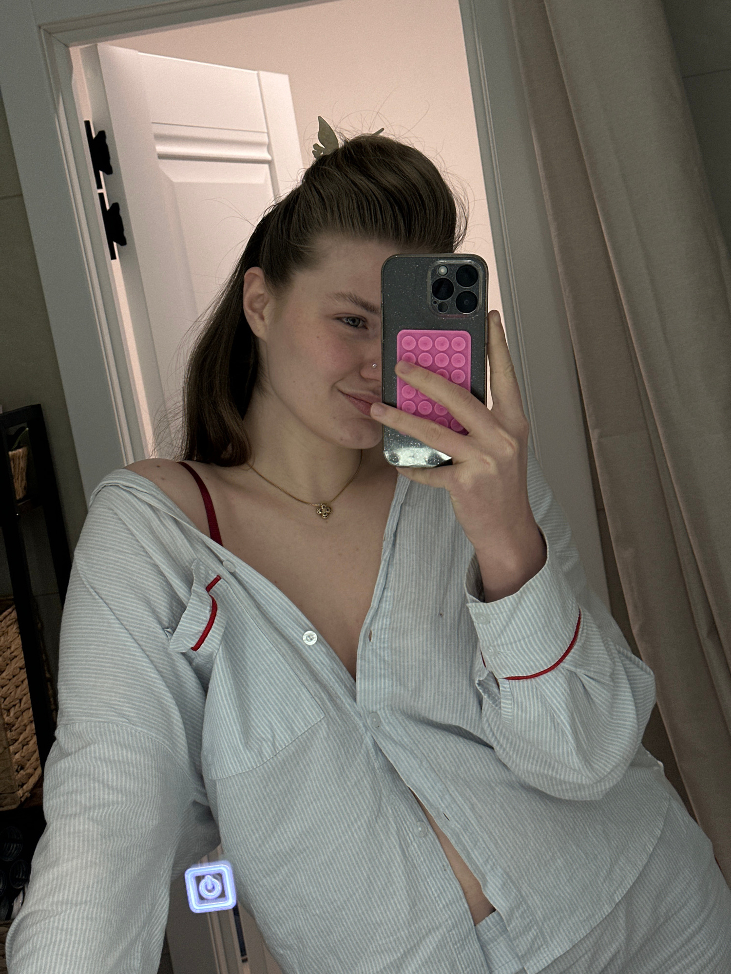 A mirror selfie shows a woman indoors wearing a partially unbuttoned, striped, long-sleeved shirt with red trim. She is holding a phone with a pink accessory on the back. A gold necklace with a clover…read more