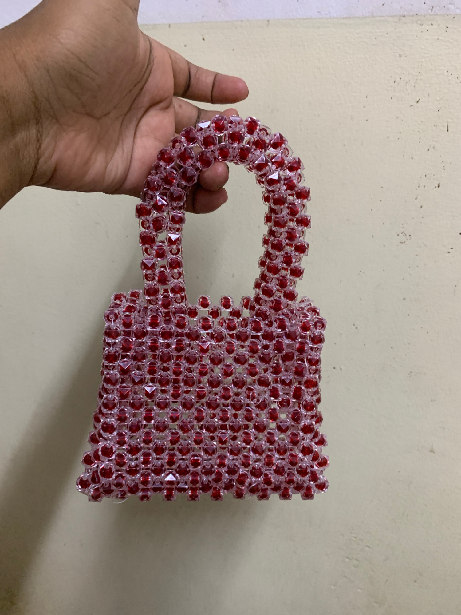A close-up, eye-level shot captures a person's hand holding a handcrafted item made of red and clear faceted beads against a light-colored wall. The main subject is the intricately beaded object, whic…read more