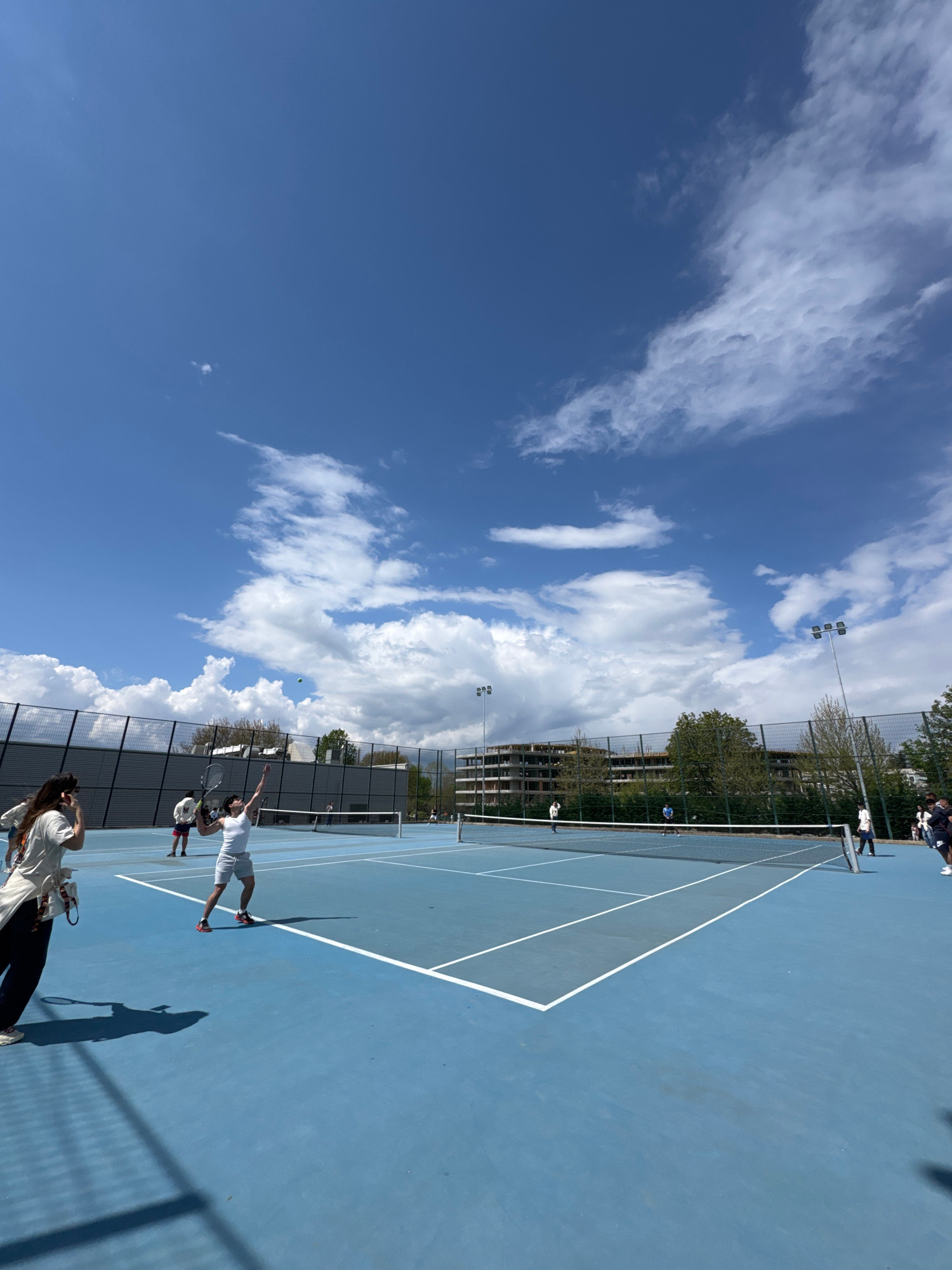 A tennis court is visible under a partly cloudy sky. The court is blue with white lines marking its boundaries. Two players are in action on the court, with one in the midst of serving the tennis ball…read more