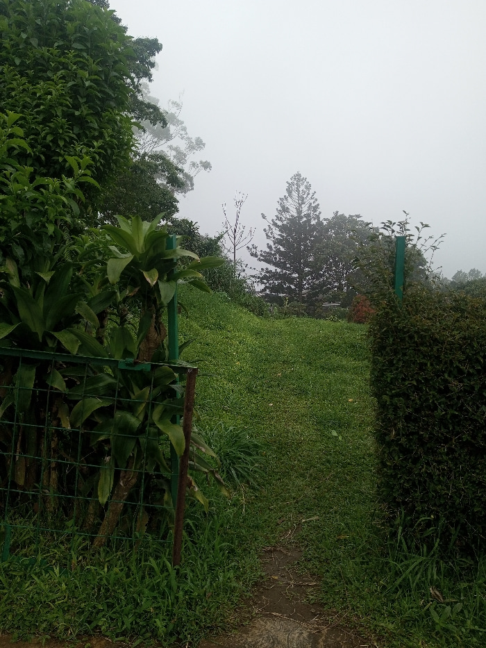 The image displays an outdoor, natural landscape in Irupalai, Sri Lanka, shrouded in heavy mist or fog that obscures the distant horizon. The foreground features a dark green wire mesh fence on the le…read more