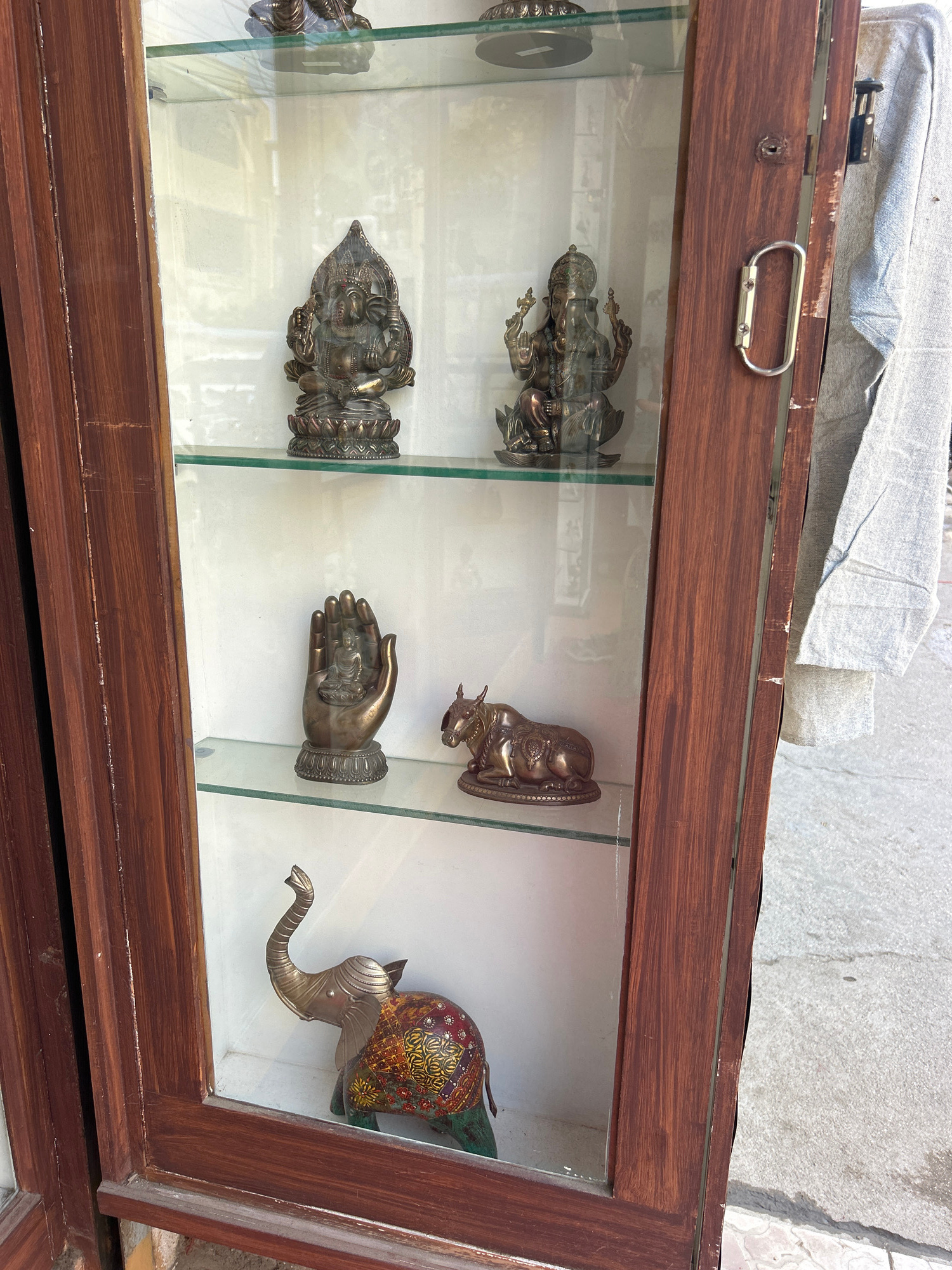 The image shows a glass display case containing various small metal sculptures. The case is made of dark wood with a silver handle on top. Inside, the sculptures include representations of deities, a…read more