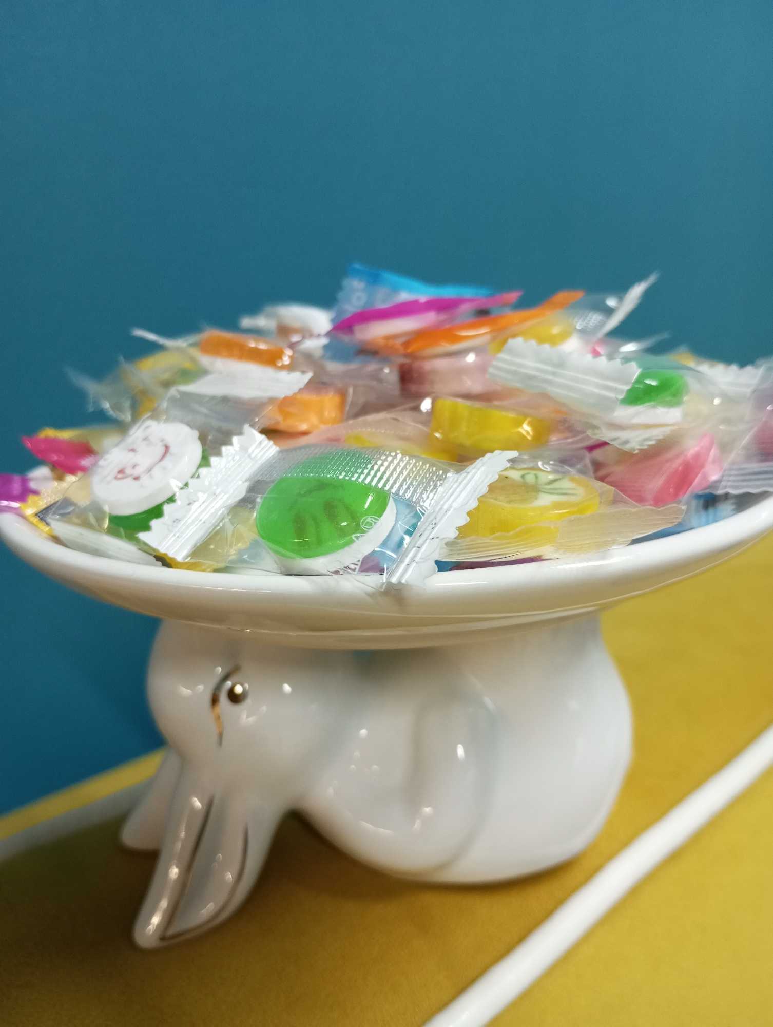 A close-up shows a white, ceramic elephant stand topped with a shallow, round dish overflowing with individually wrapped hard candies in various colors. The candies are mostly round and wrapped in cle…read more