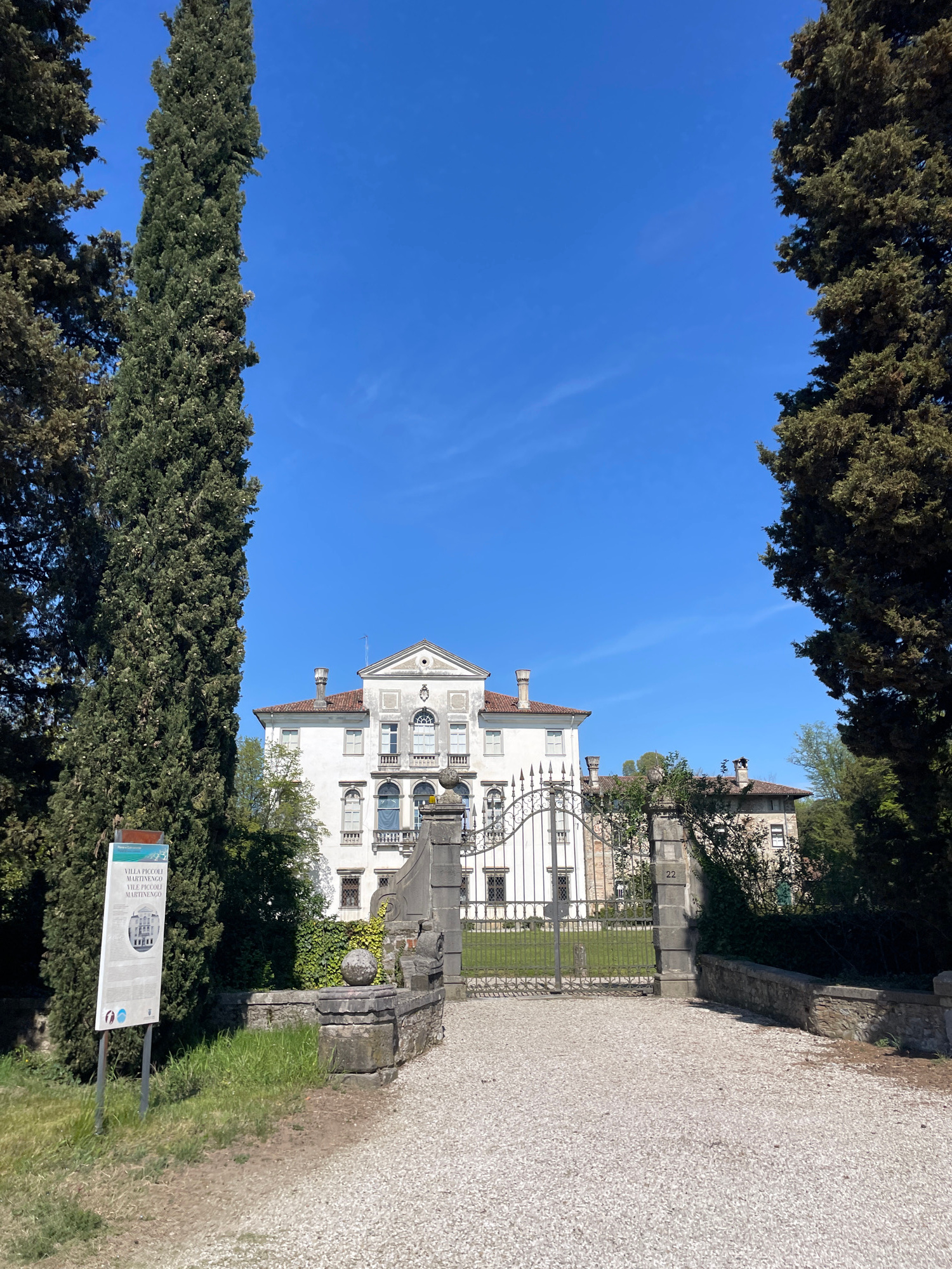 The image is an eye-level shot of a white, multi-story building in San Lorenzo, Italy. The building, partially obscured by trees and an iron gate, features architectural details such as arched windows…read more