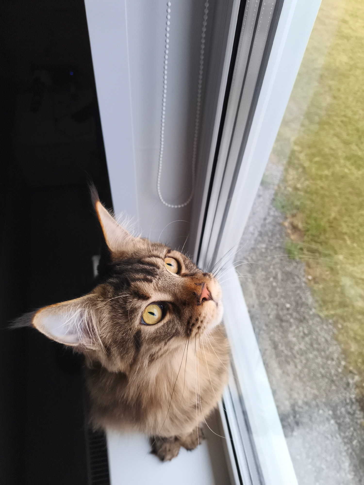 A Maine Coon cat sits on a window ledge, looking upwards. The cat has brown tabby fur with yellow eyes and long whiskers. The cat is sitting beside a white window frame with closed white blinds. Outsi…read more