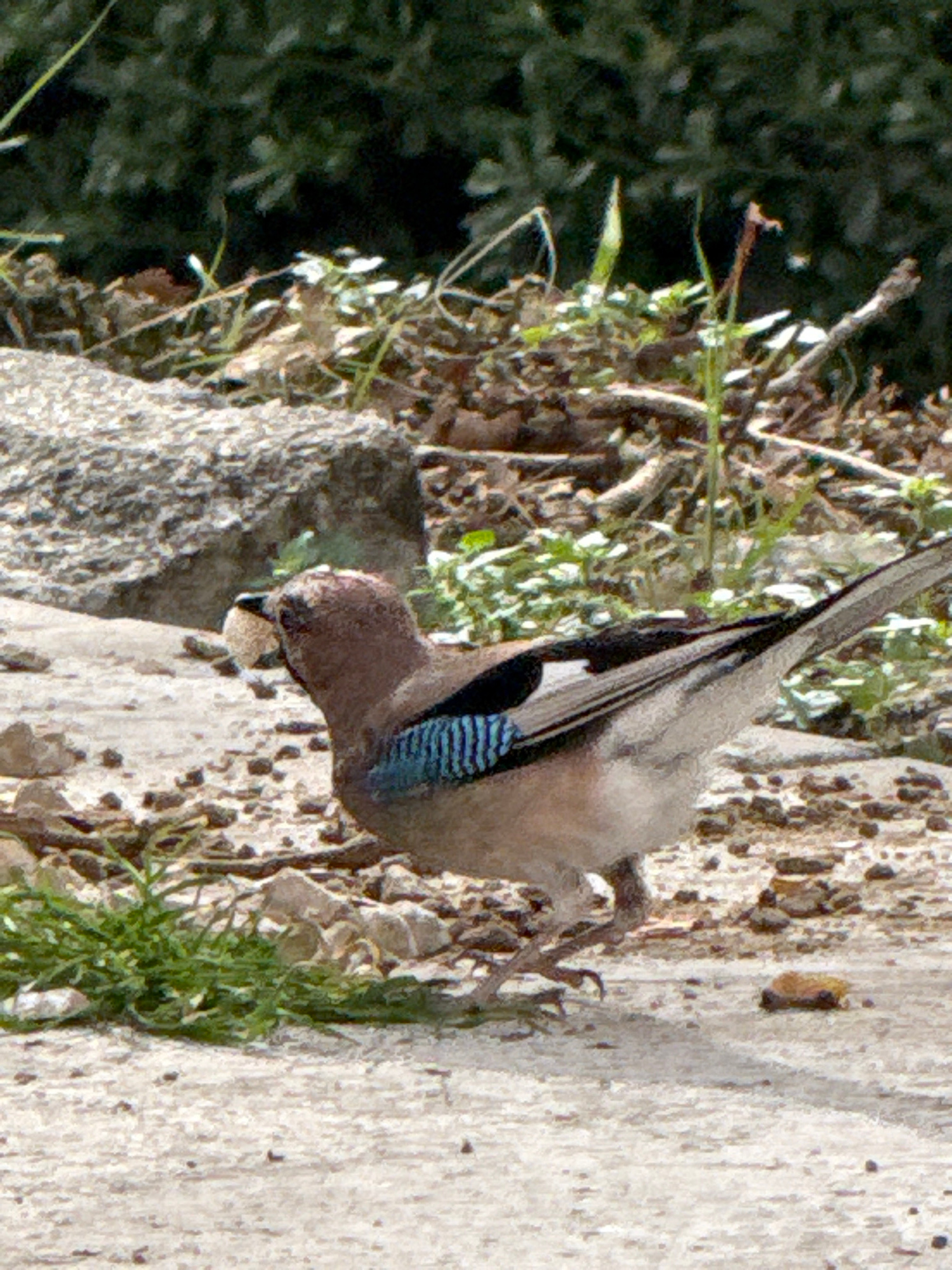 A Eurasian jay (Garrulus glandarius) is perched on a rock face, possibly in Herceg Novi, Montenegro. The bird is oriented upside down, its head pointed towards the lower part of the frame, appearing t…read more