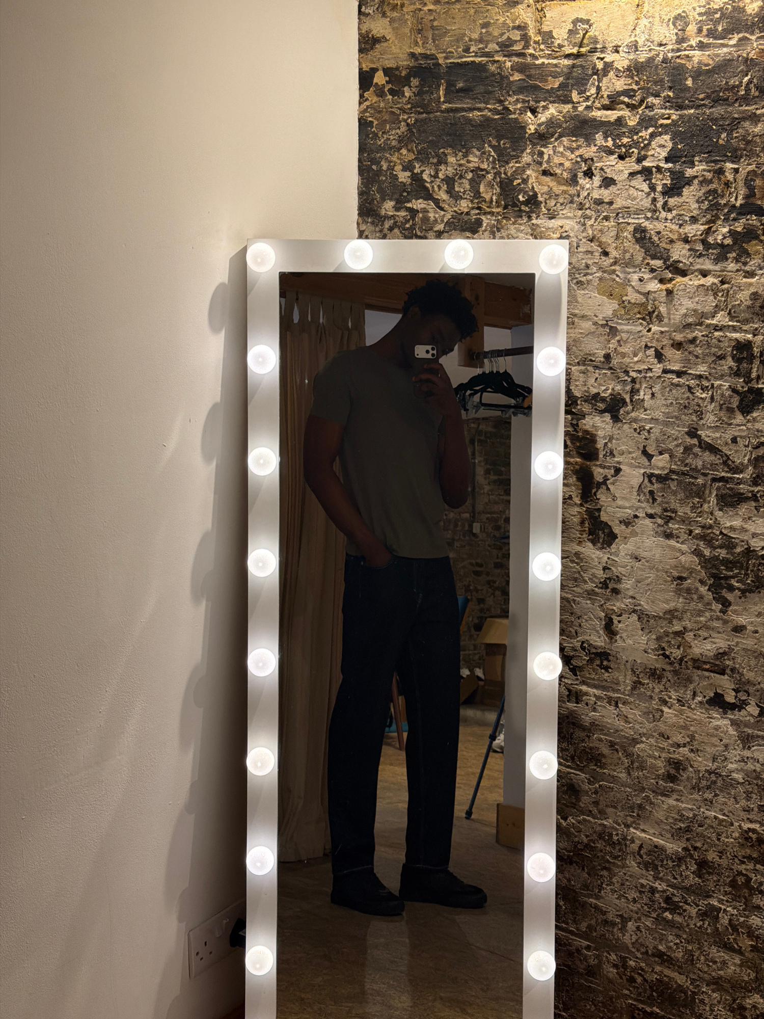 A person is reflected in a mirror, taking a selfie. The mirror has a white frame and is lined with round light bulbs. The person is Black, wearing a green t-shirt, black pants, and black shoes. They a…read more