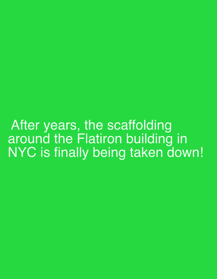 The image is a green background with white text. The text states, "After years, the scaffolding around the Flatiron building in NYC is finally being taken down!" The location is the Flatiron Building…read more
