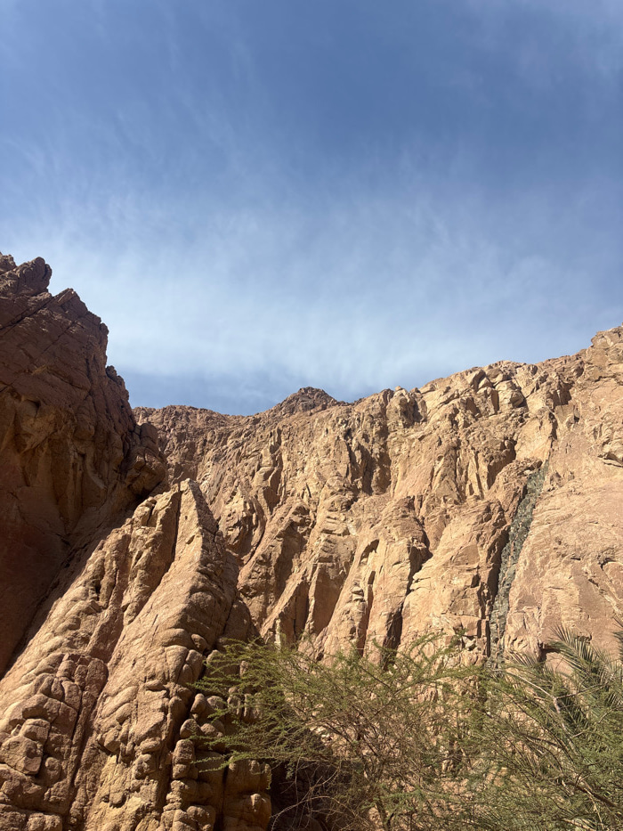 The image displays a desert mountain landscape located near Dahab, Egypt. Predominant features are tall, fractured rock formations exhibiting a reddish-brown coloration, consistent with sandstone or g…read more
