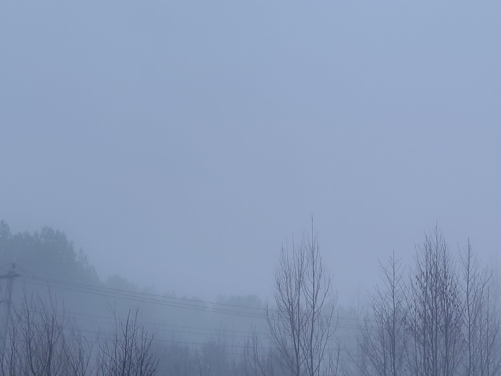 The image depicts a hazy, overcast scene in Chaikovsky, Russia. Bare trees and shrubs are visible in the foreground, with a dense line of trees shrouded in fog in the background. Power lines run horiz…read more