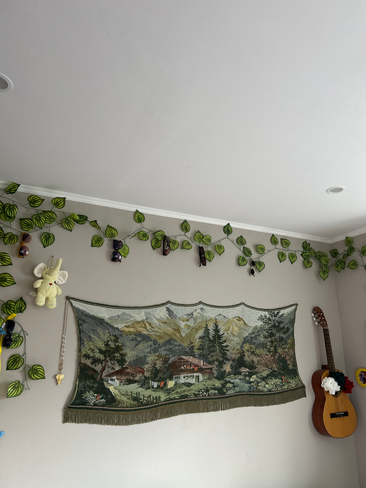 The image shows a wall decorated with various items. A tapestry depicting a mountain scene hangs on the wall. A guitar with floral decorations rests above the tapestry. An artificial vine with sunglas…read more