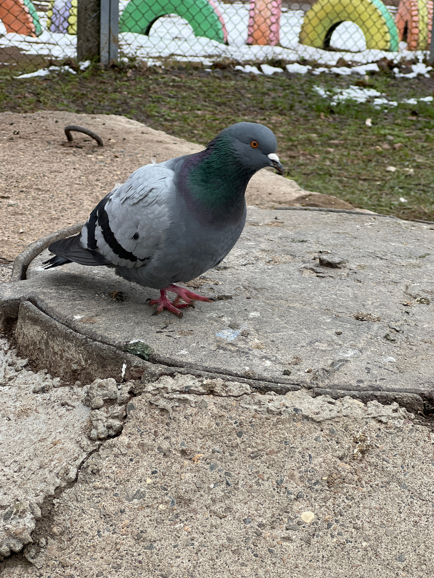 The image depicts a pigeon standing on a concrete surface, possibly a sidewalk or ledge. The bird has gray and black plumage with iridescent green and purple coloring on its neck. It has orange eyes a…read more