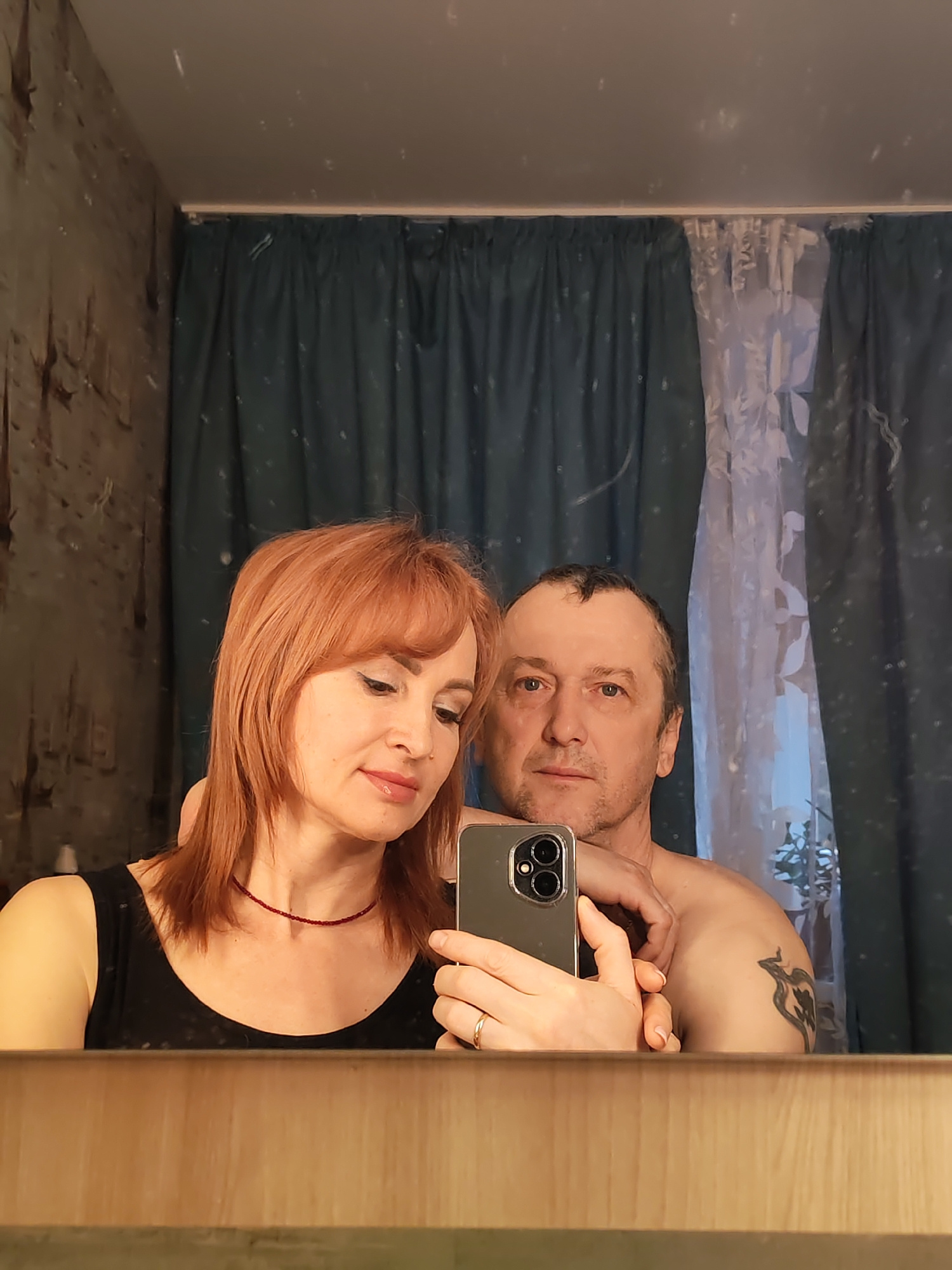 A selfie shows a middle-aged couple reflected in a mirror. The woman has shoulder-length red hair, and she wears a black tank top and a red beaded necklace. She is holding a smartphone in her right ha…read more