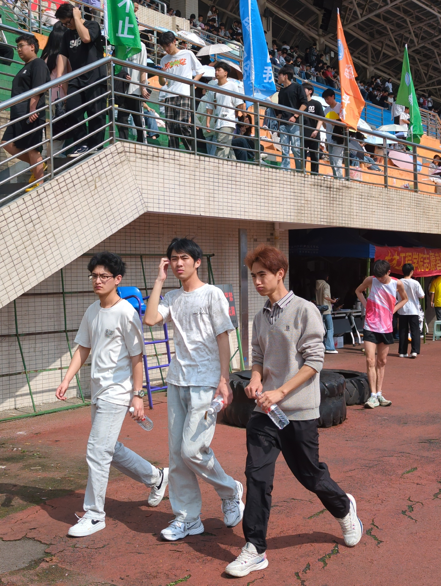 The image depicts an outdoor scene with a crowd of people in a stadium setting, possibly in Jiangjin, China. There are three young men in the foreground, each holding a plastic water bottle. One is we…read more
